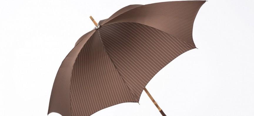 Maglia Francesco created another masterpiece with this unique handmade umbrella in their famous workshop in Milan. They are known for their impressive craftsmanship and old-fashioned sensibilities and this umbrella is no exception. The shaft is made of a solid single piece of cherry wood, with a polished bark handle. The length of this umbrella is 37 inches and the brown striped canopy has a nice matching cover. This model also features a horn tip and nickel plated brass material to make it as elegant as it is strong enough to keep a master dry and elegant.