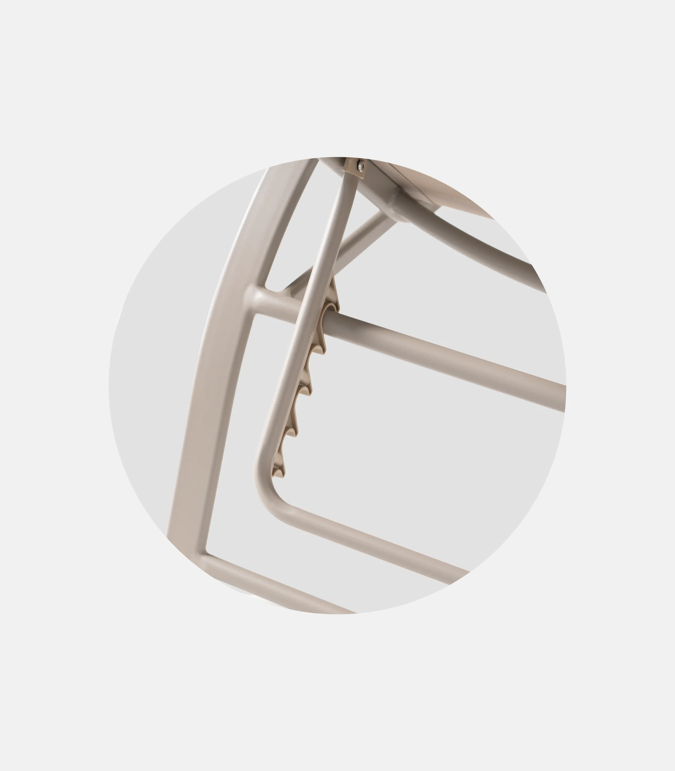 It is constructed with an aluminum frame (1.5–1.7mm), electrostatic powder coating, and 4 reinforcing struts. The perforated overnylon 2×1 (650gr) and protective elements on the base complete an ensemble aimed at durability and proper stacking.