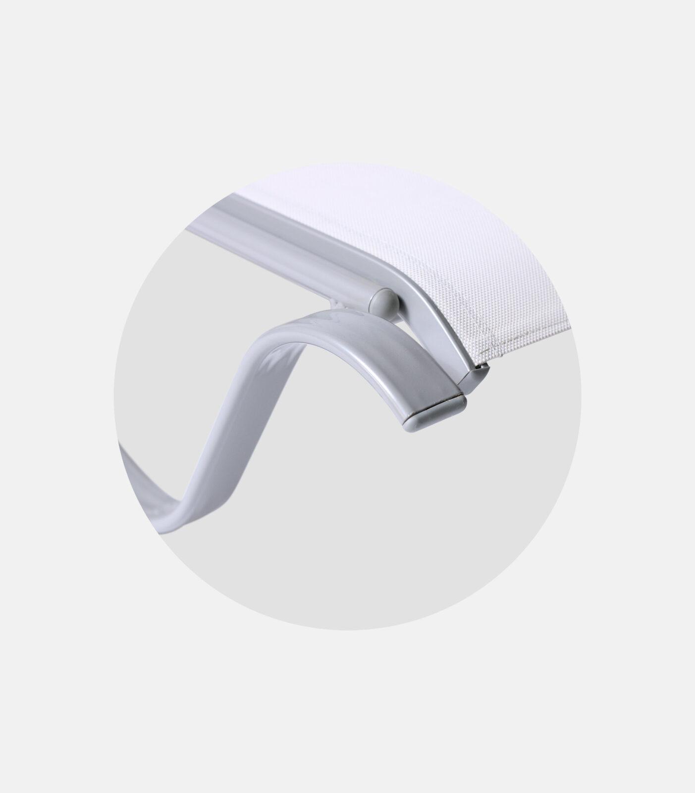 Its base is an aluminum frame (1.5–1.7mm) with electrostatic powder coating, reinforced with 4 struts. The perforated overnylon 2×1 (650gr), protective caps on the bottom, and anatomical tilt aid both in use and storage/stacking.