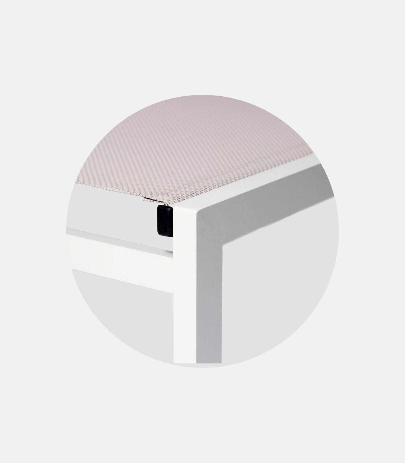 Built on a 2mm aluminum frame with electrostatic powder coating and 4-rib reinforcement, featuring perforated overnylon in weave/weight options. Option to add wheels to the rear legs, while polyamide base protectors and anatomical tilt support daily use and proper storage.