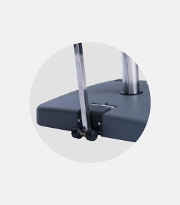 The support tube accommodates poles of Ø80/Ø100/Ø120 and is also available for smaller diameters (Ø42/Ø48/Ø60). The base dimensions are 30×30cm and can be painted in various shades to match the establishment’s concept.