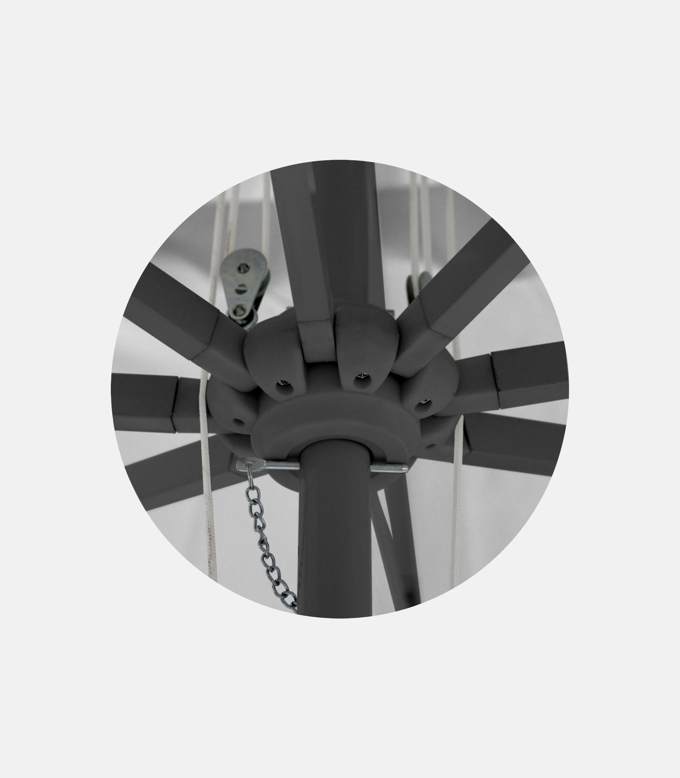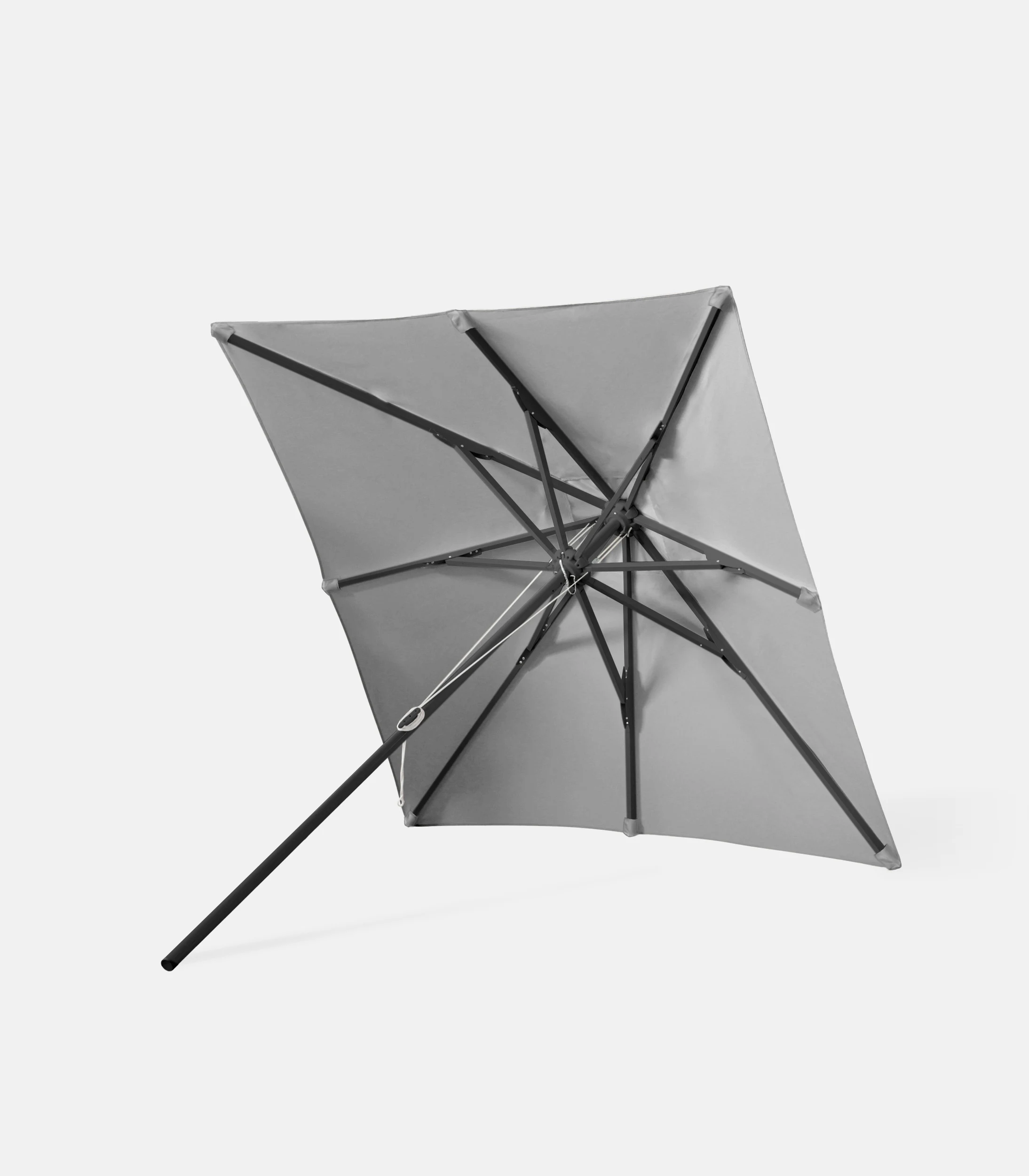 The square canopy is supported by a heavy-duty construction, so the opening remains uniform and the geometry stays stable in everyday use. The pulley mechanism makes operation practical, while the top vent helps release built-up air. The canopy is made from 280 g acrylic fabric with waterproofing and UV protection.