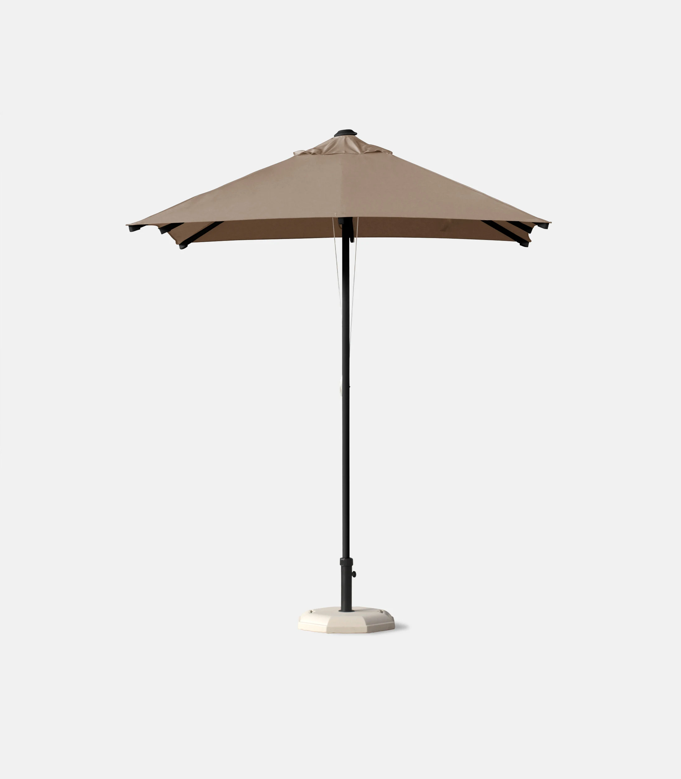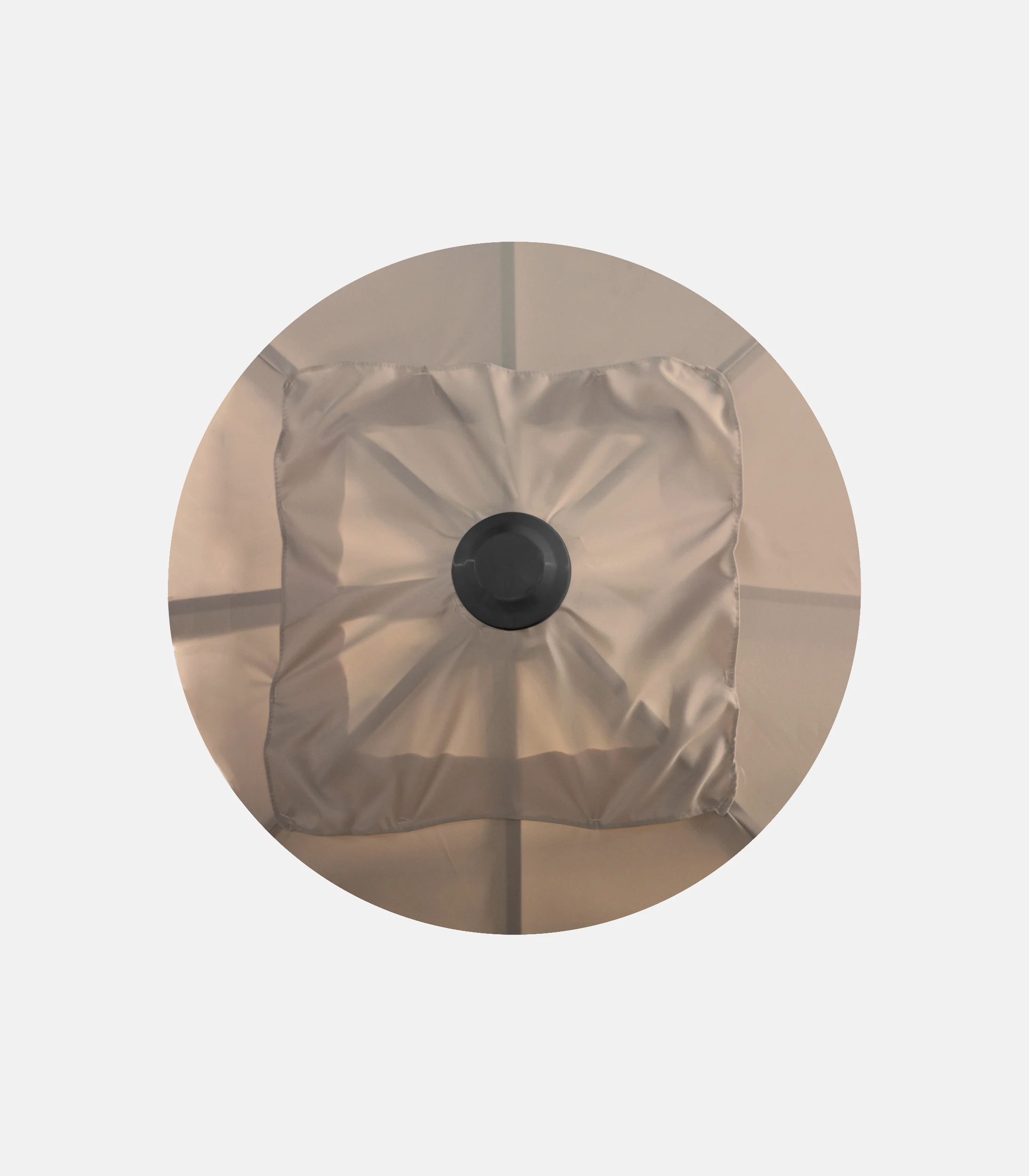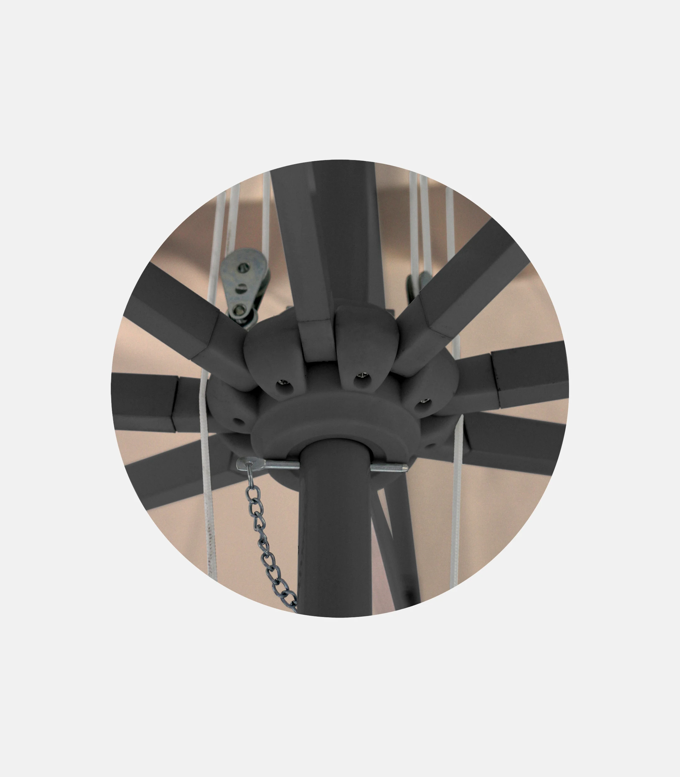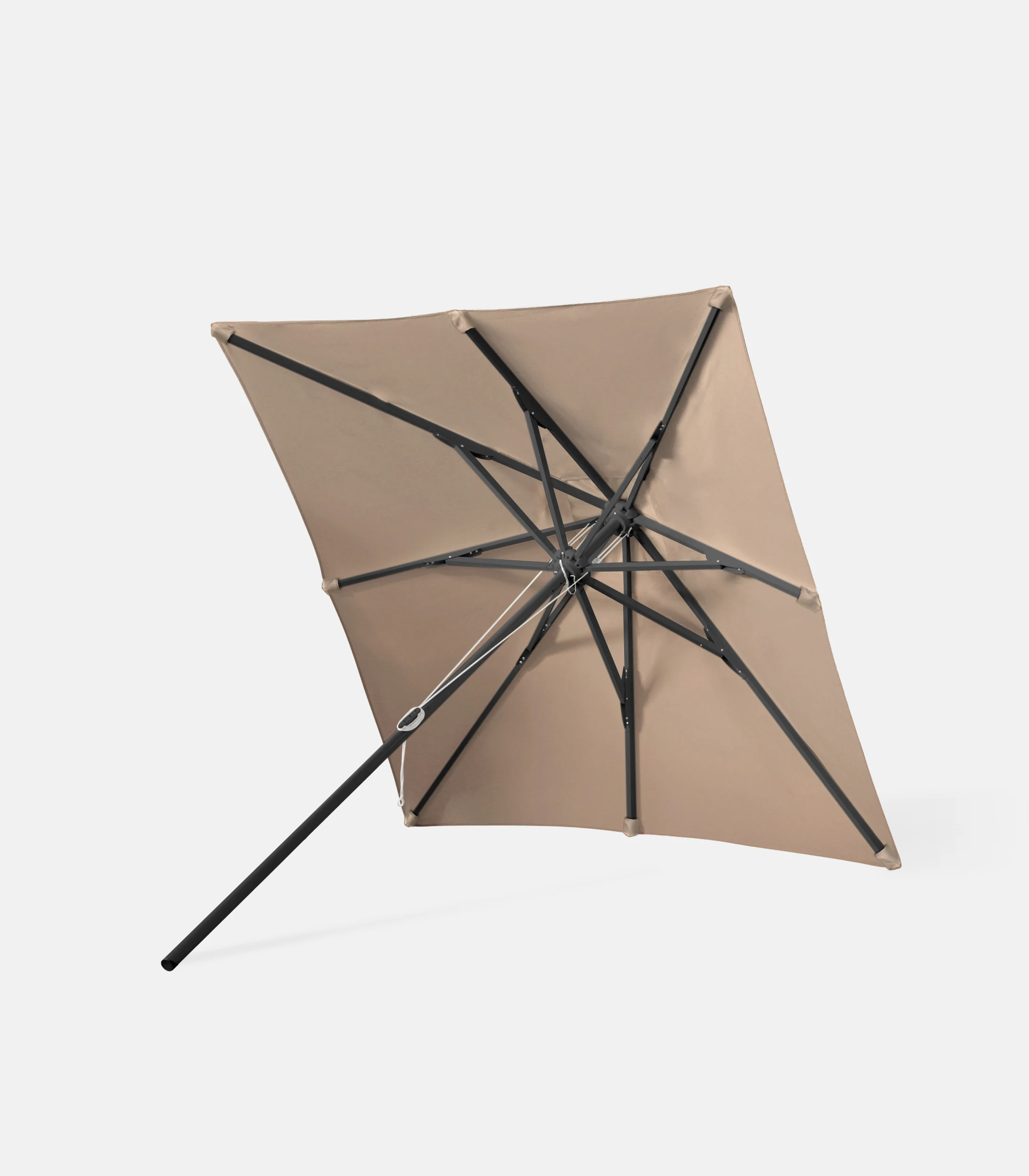 The 2.20 × 2.20 m square version in mocca delivers a warmer, more refined aesthetic, with a clean outline and a strong sense of quality. The shade highlights the umbrella’s geometry and makes the shading feel carefully considered, both up close and from a distance.