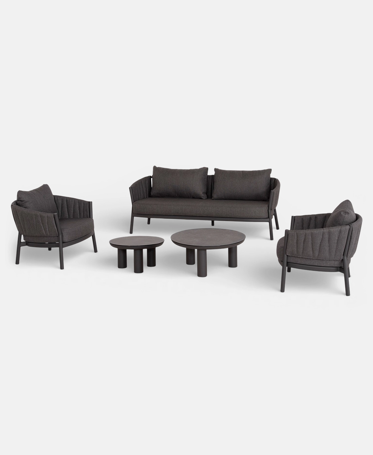 - 5-piece outdoor lounge set: 3-seater sofa, 2 armchairs, and 2 round tables (in different dimensions)