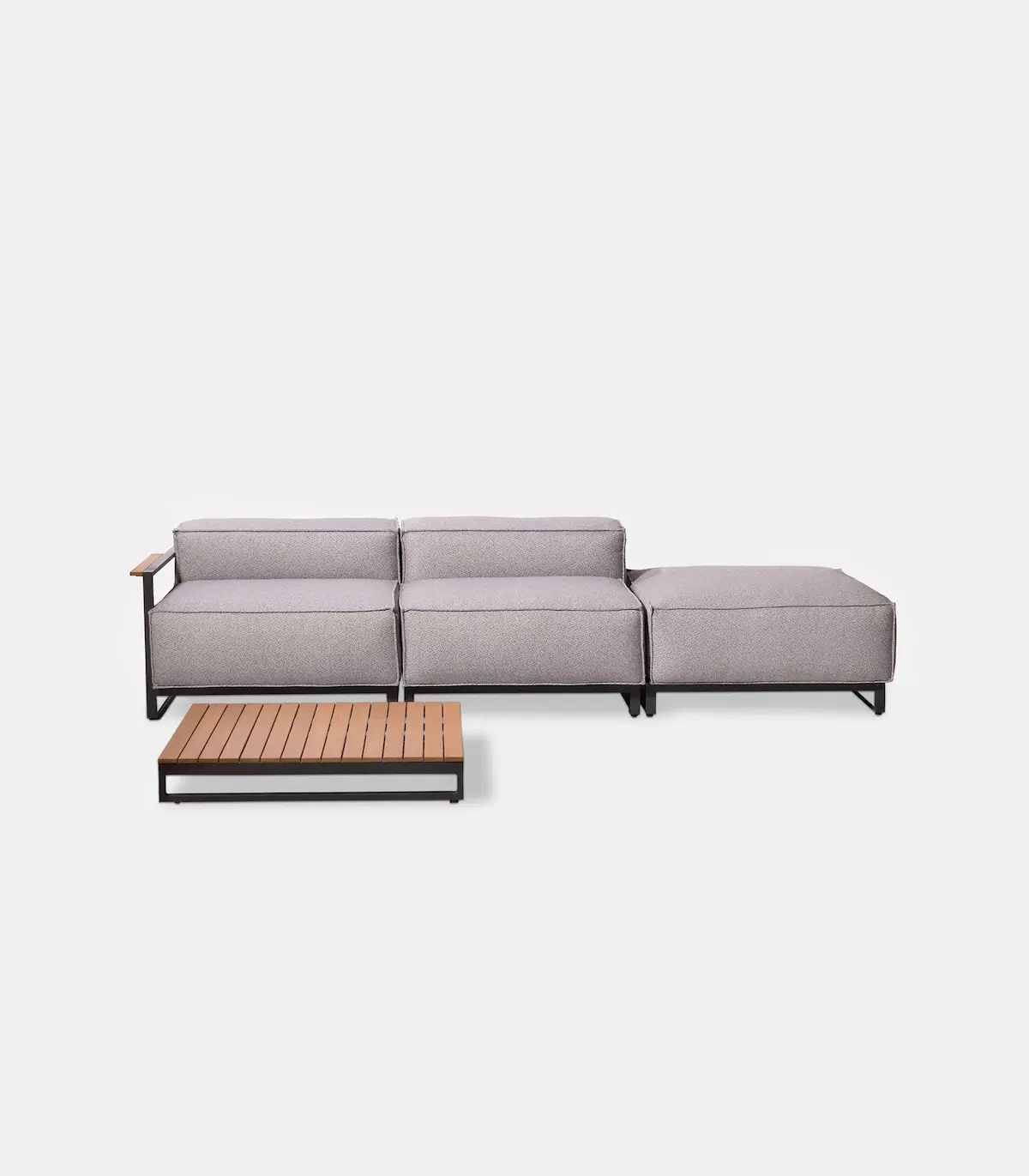 • Includes: 2 armchairs with arms (100 x 100 x 64 cm each), 1 right-arm module (100 x 100 x 64 cm), 1 left-arm module (100 x 100 x 64 cm), 1 armless module (100 x 100 x 60 cm), 1 ottoman (95 x 100 x 46 cm) and 1 coffee table (100 x 100 x 9 cm)