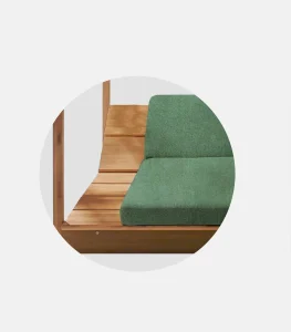 The galvanized metal frame with electrostatic paint is combined with 14cm cushions (220gr spun-polyester with PU coating) on breathable 750gr PVC (4×4 weave). Shading is provided by a folding 160gr polyester roof with PU and UV 50+ protection, complemented by curtains on each side.