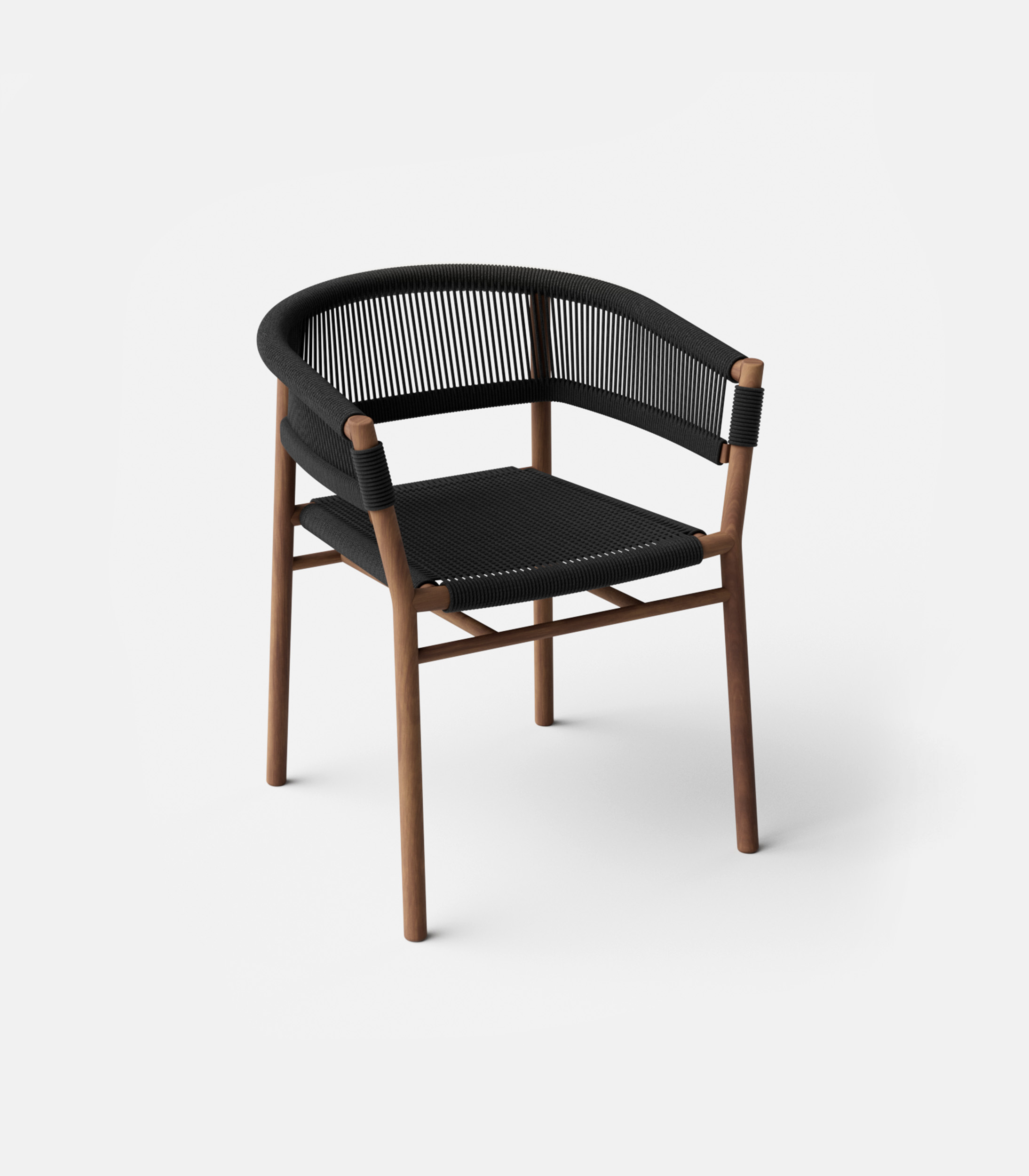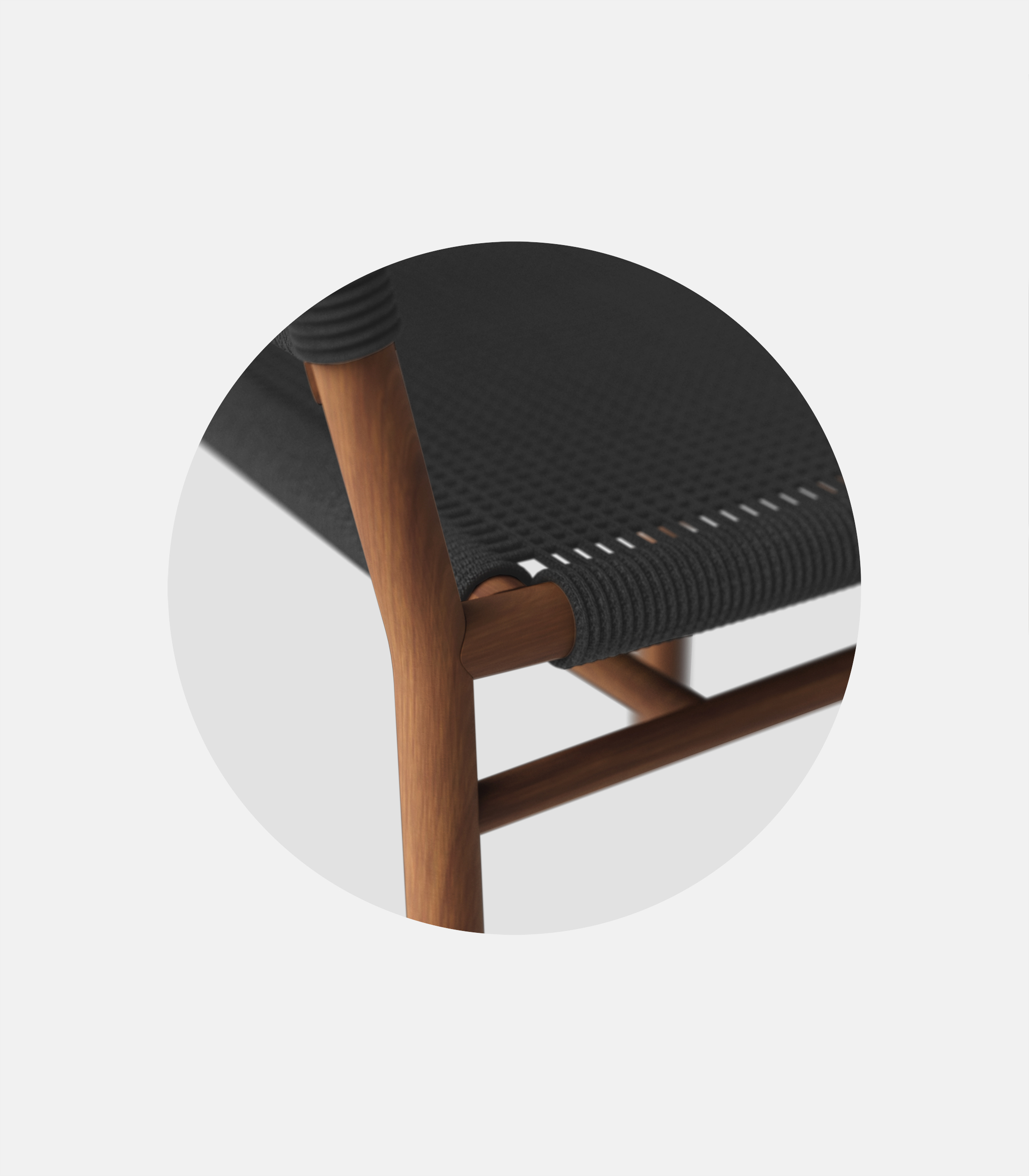 The PW-02 is a teak armchair with outdoor woven rope and teak oil impregnation. The black shade of the rope gives a more “modern” look, while its stackability makes it practical for professional use.