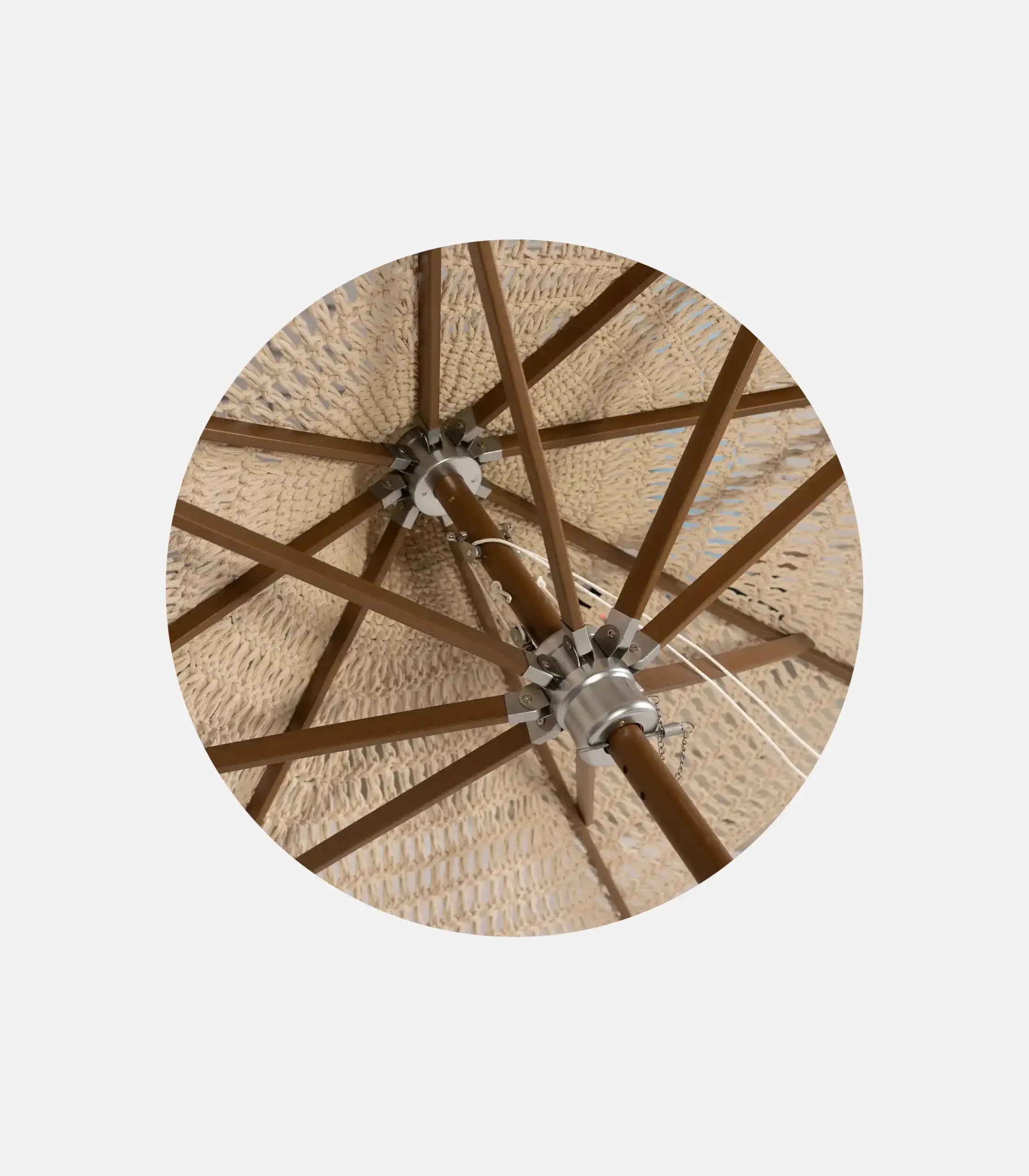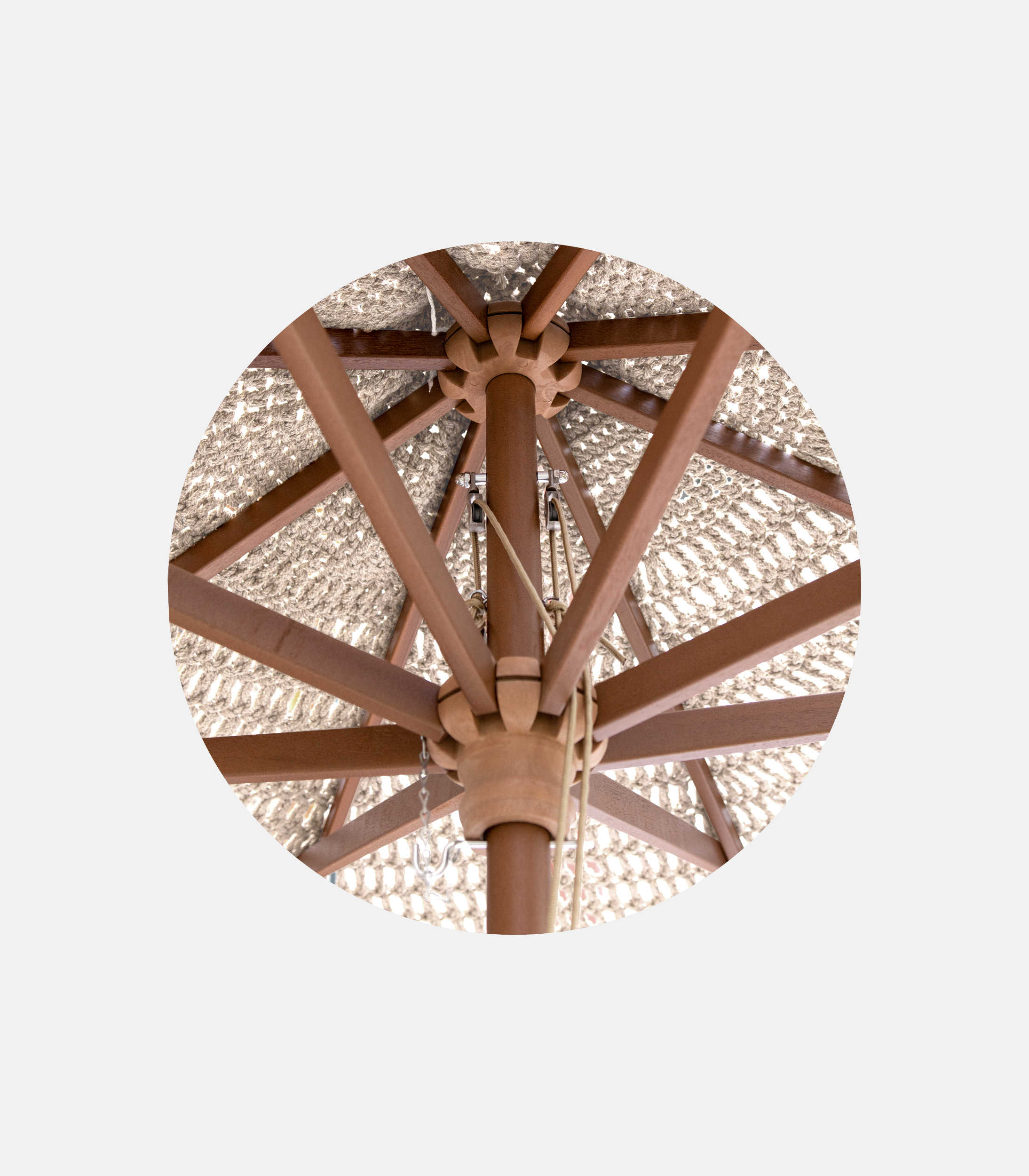 The frame is based on a Ø48 (2.8m) beechwood pole and 8 ribs (35×20mm), featuring a double pulley and 3 reclining levels. The reinforced aluminum hub and stainless steel connections at critical points make the construction more robust and reliable.