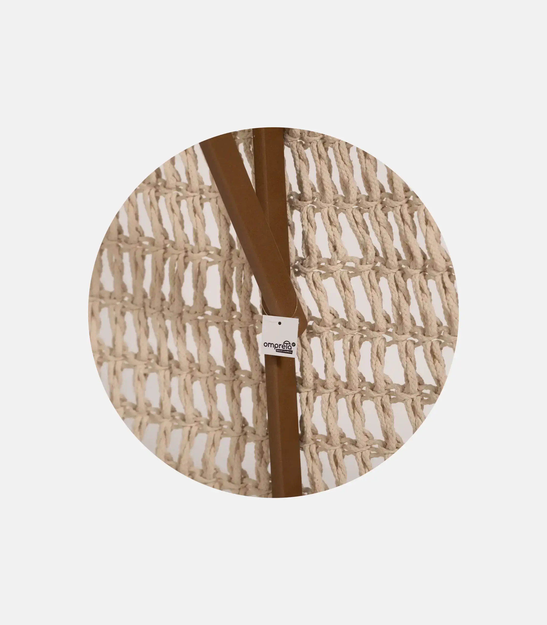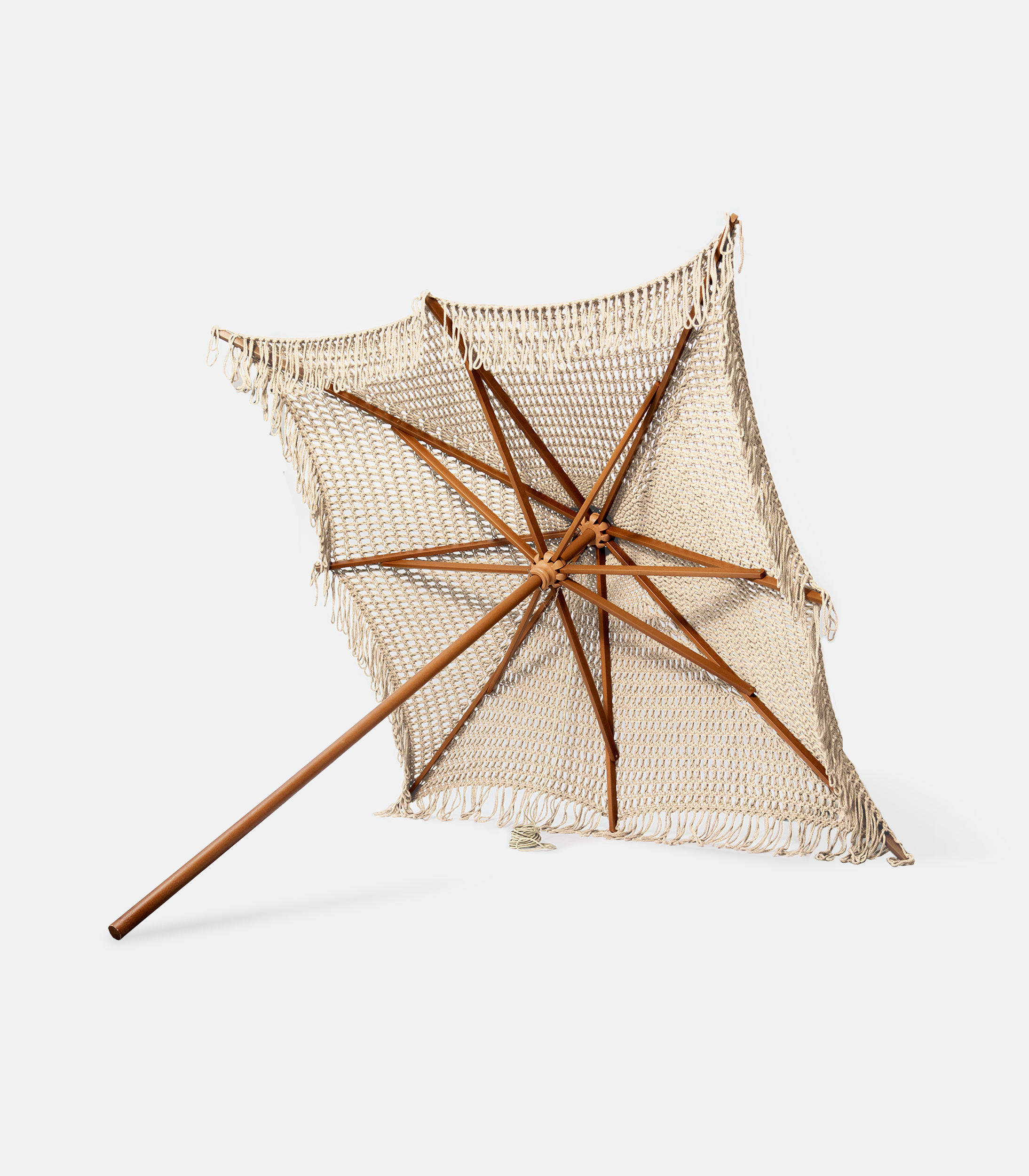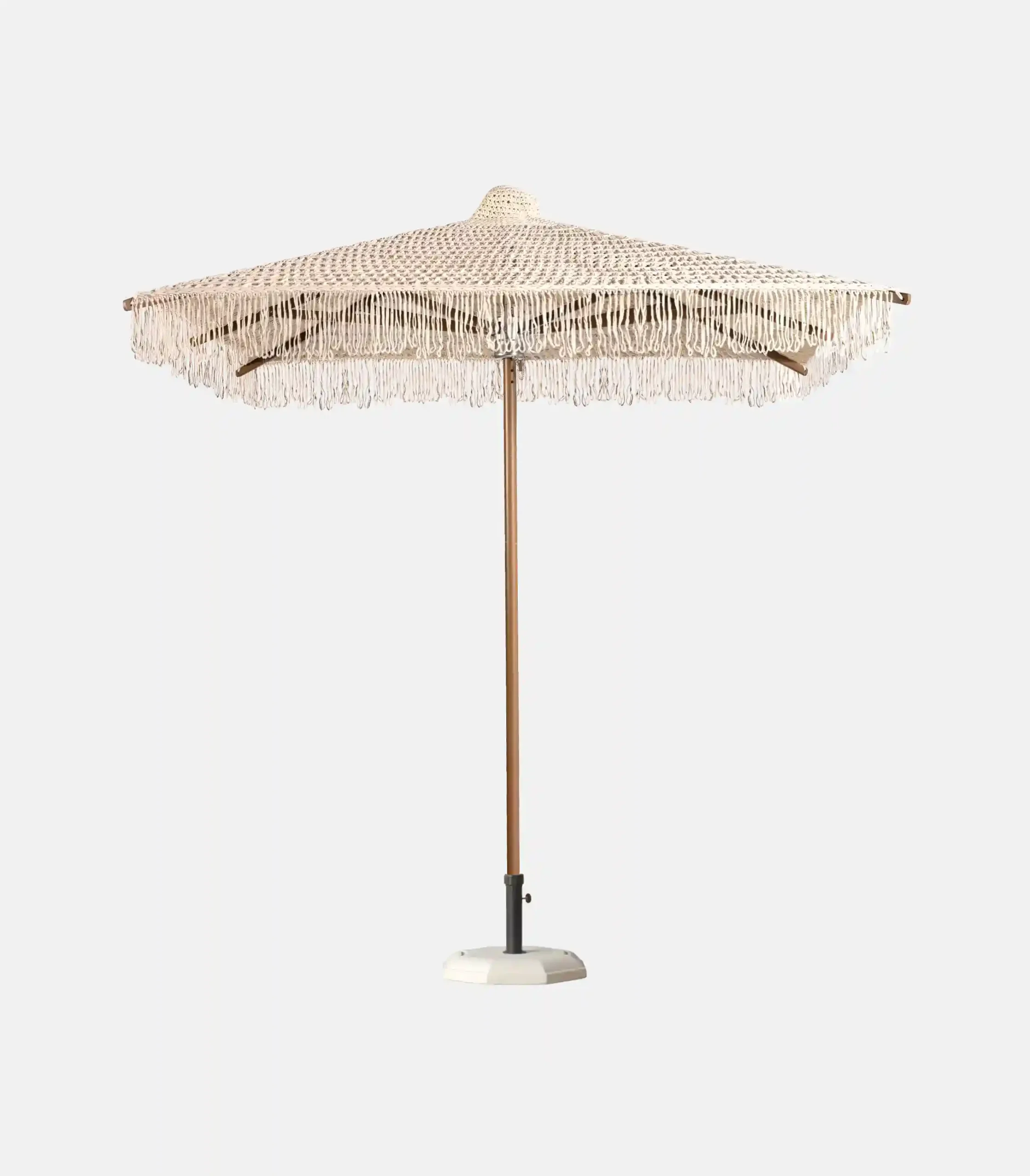 Square hand-woven rope wooden beach umbrella with fringe 2.30 x 2.30 m – cream