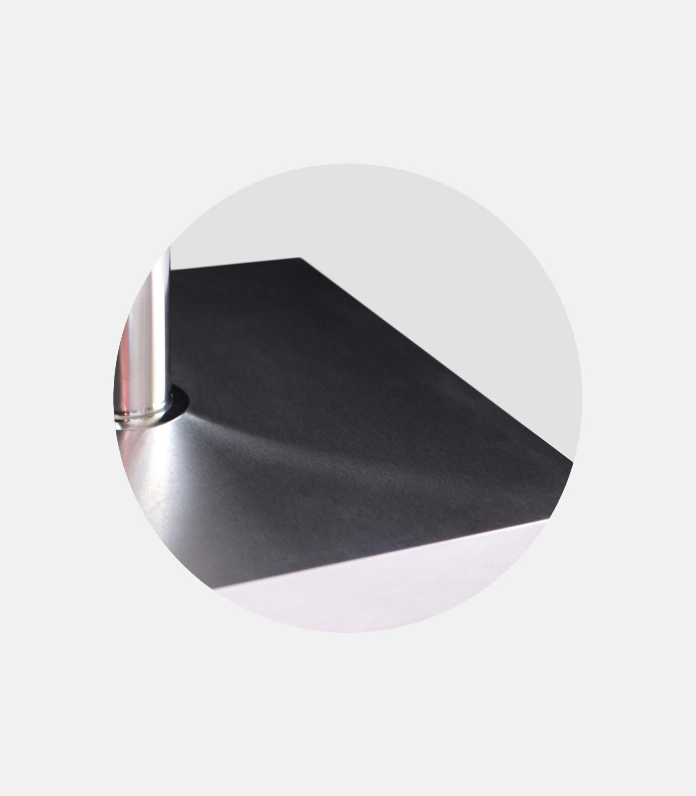 The square version of the stainless steel base for those who want a more “geometric” footprint in the space and a stricter aesthetic. It fits particularly well in symmetrical setups and modern projects.