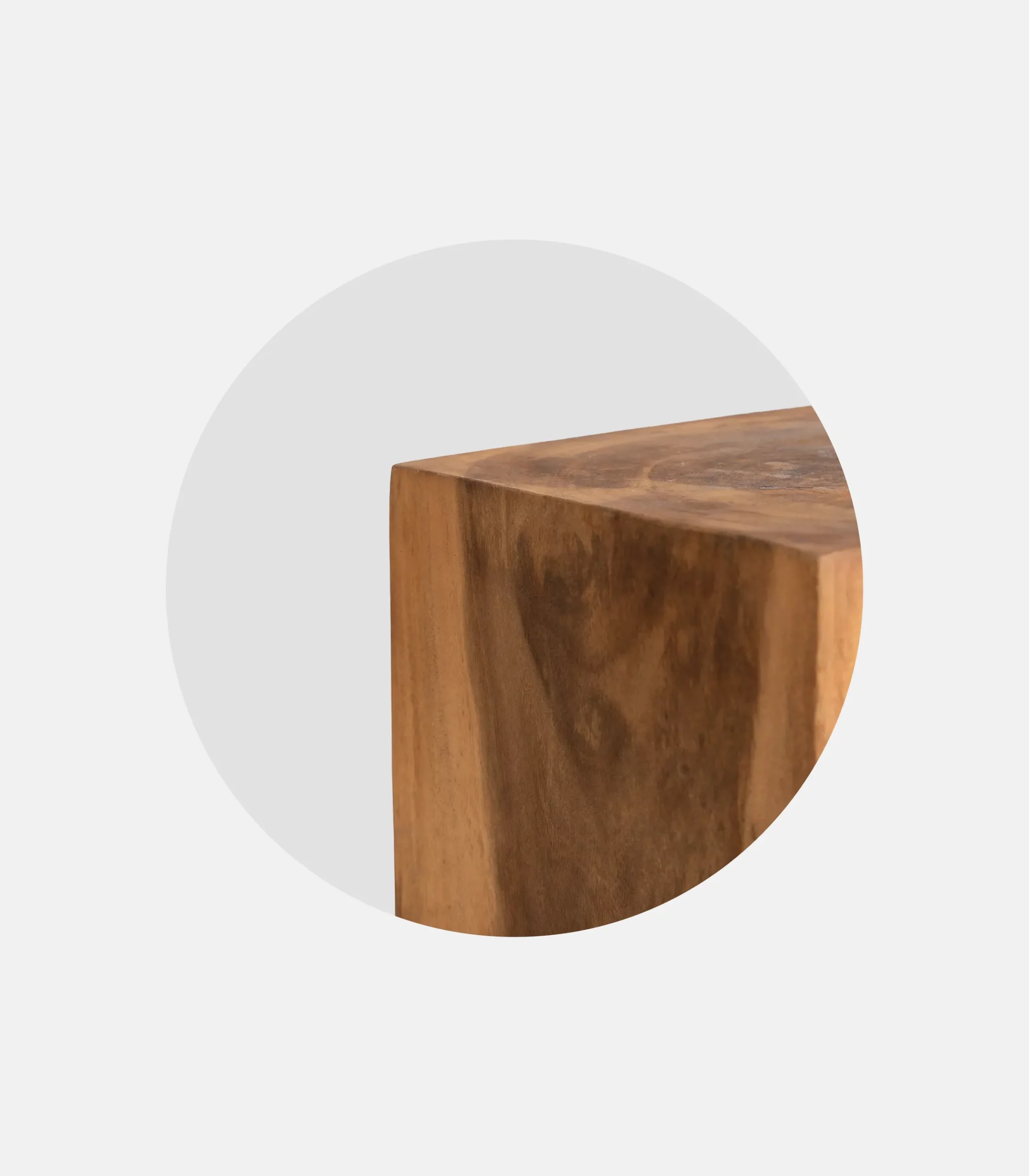 Suar is a natural material affected by changes in temperature and humidity. Due to its high moisture content, condensation may appear on the surface during transport, which might leave marks or imperfections. However, this moisture tends to evaporate over time, while potential surface alterations can lead to staining. It is recommended to avoid placing this specific wood directly onto carpets or fabrics.