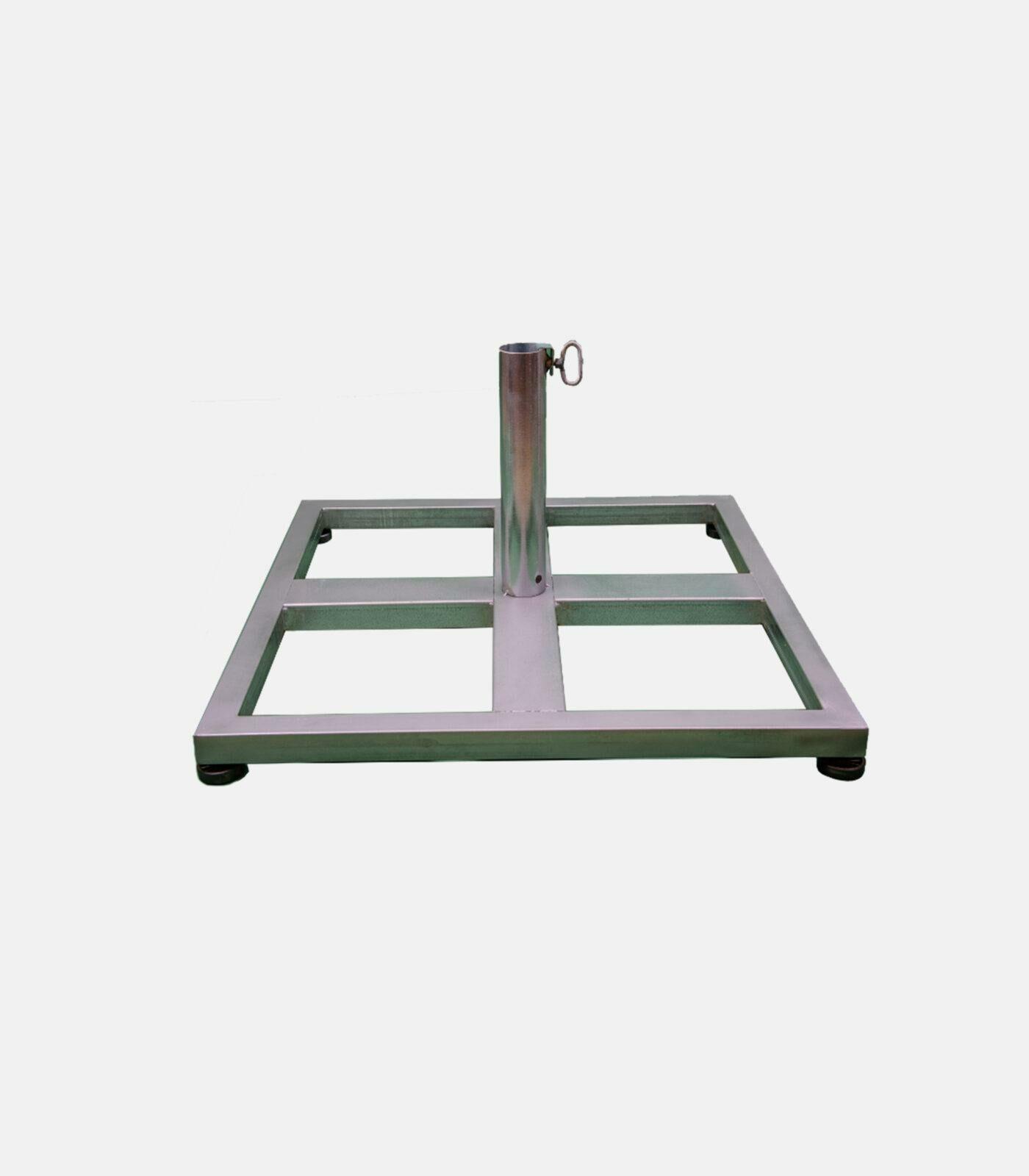 Features a metal pipe for poles from Ø48 up to Ø115mm, with a 70×70cm frame. It accommodates paving stones of 120 or 200 kg and can be painted in various shades to blend with the space.