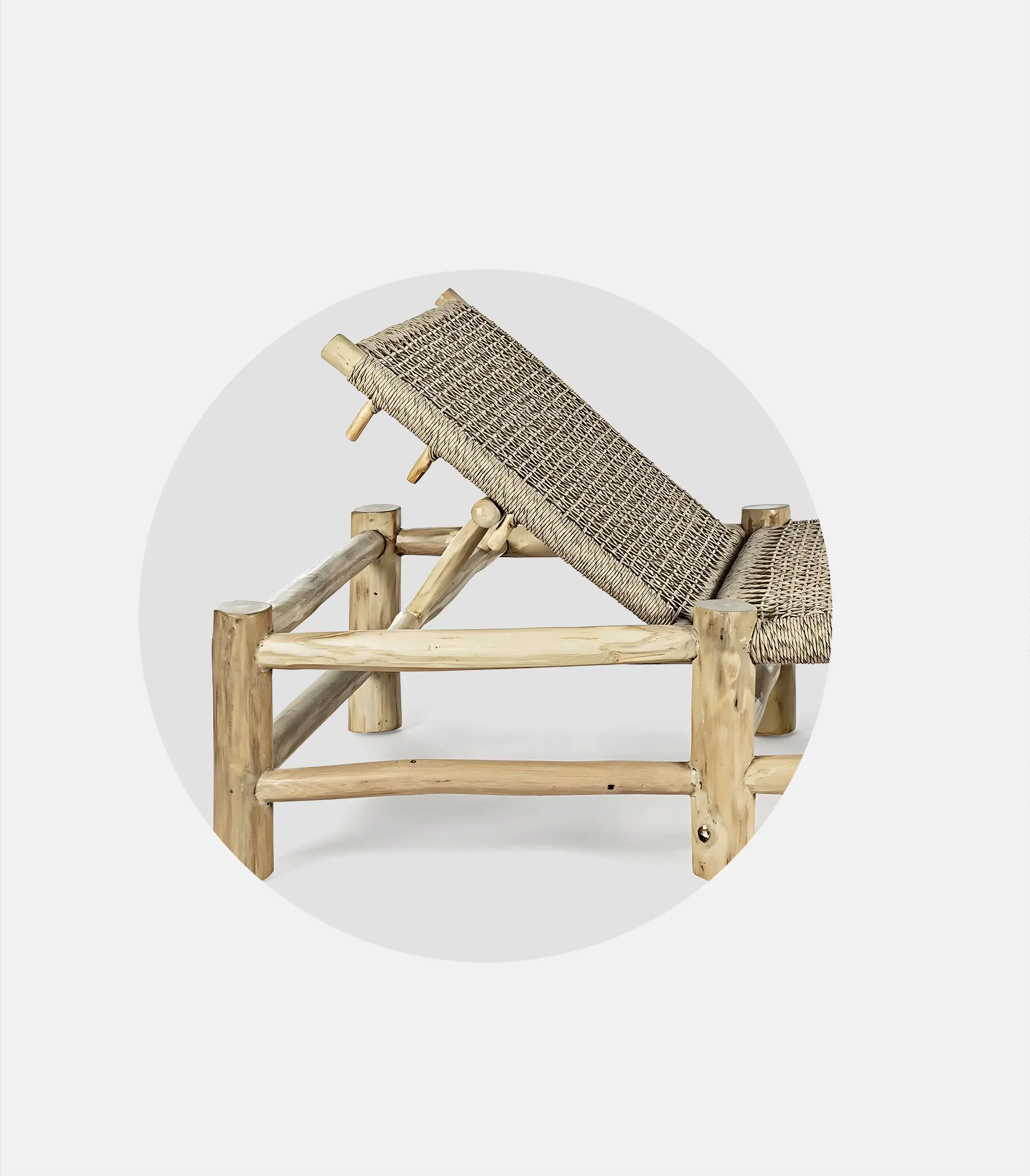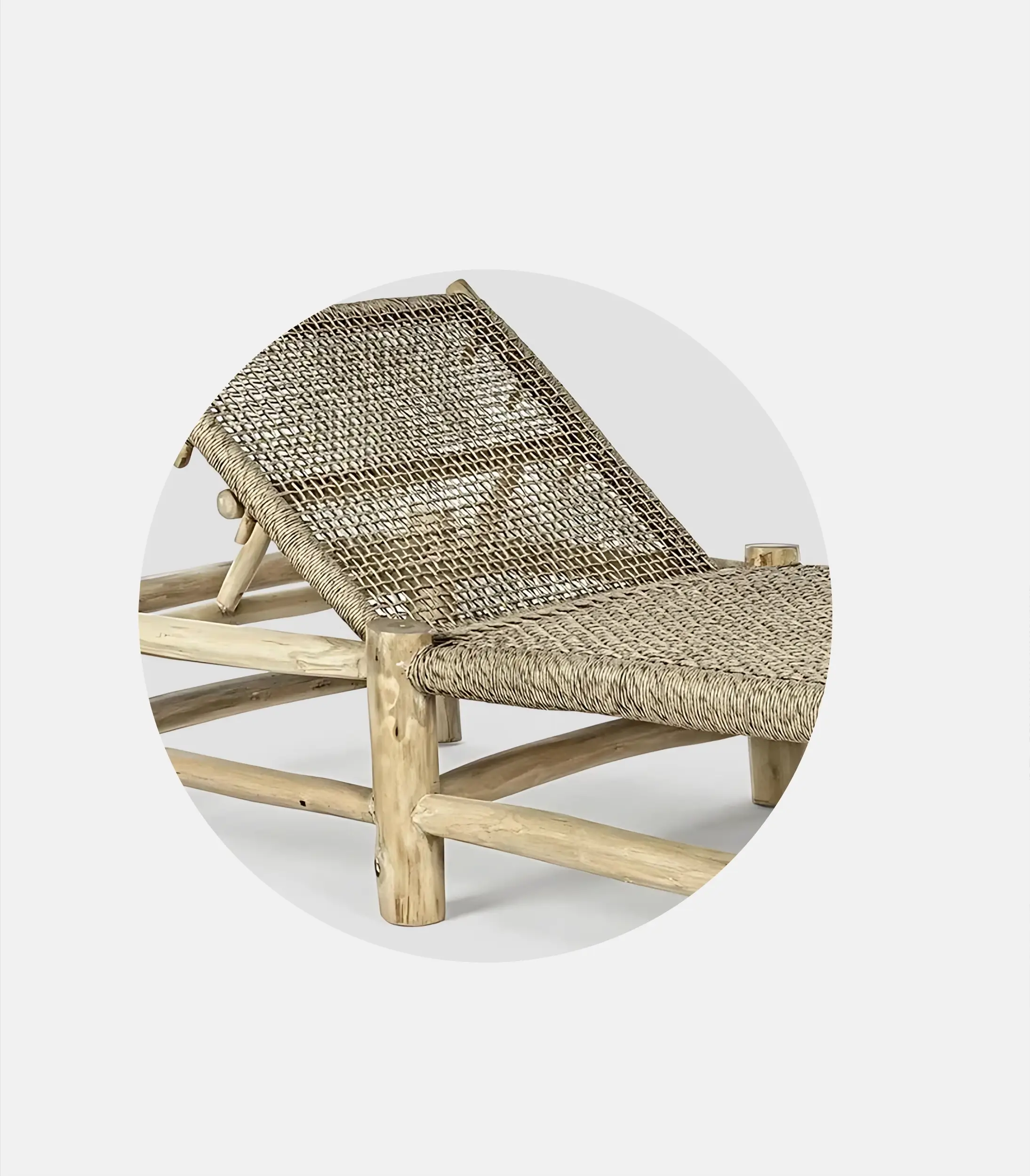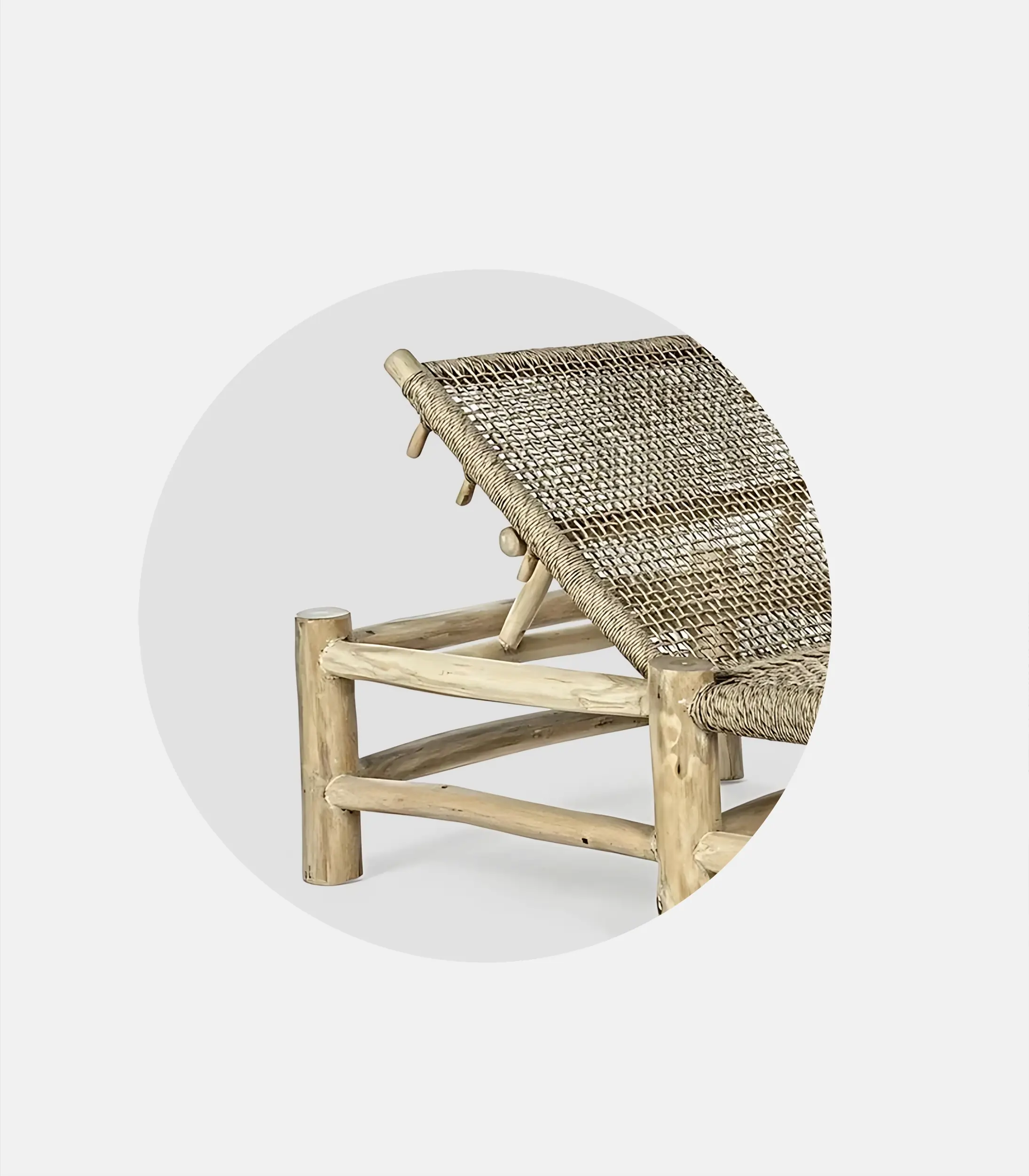 Gaia plays on a lighter, natural aesthetic, with a woven element that gives character while functioning practically. It’s handmade, from teak with teak oil finish and weaving from ecological waterproof thread with UV protection.