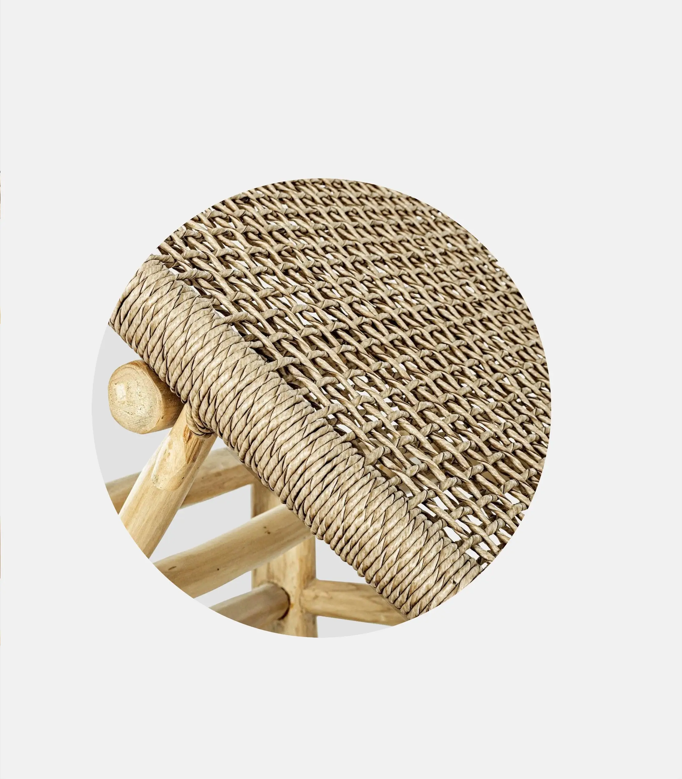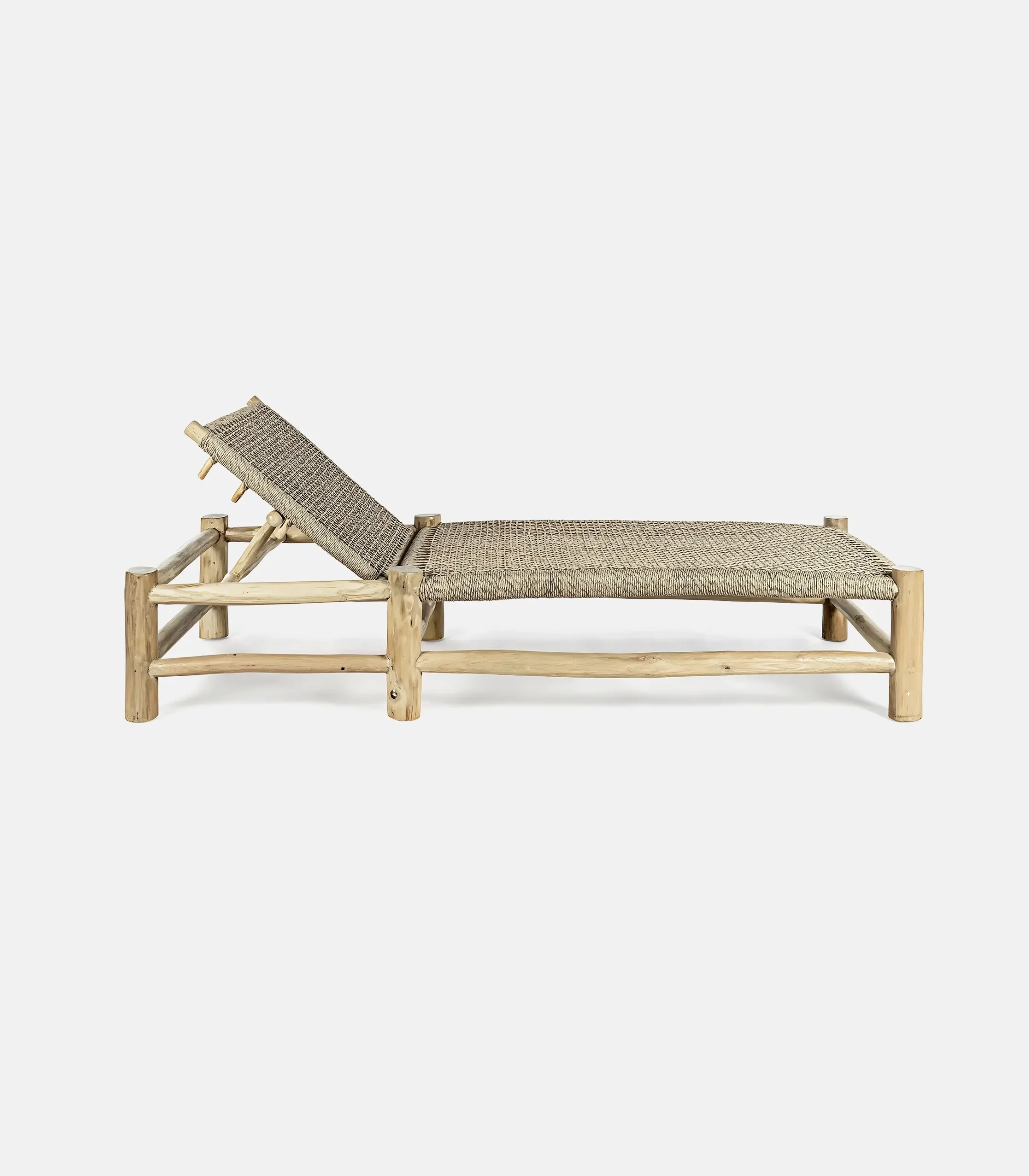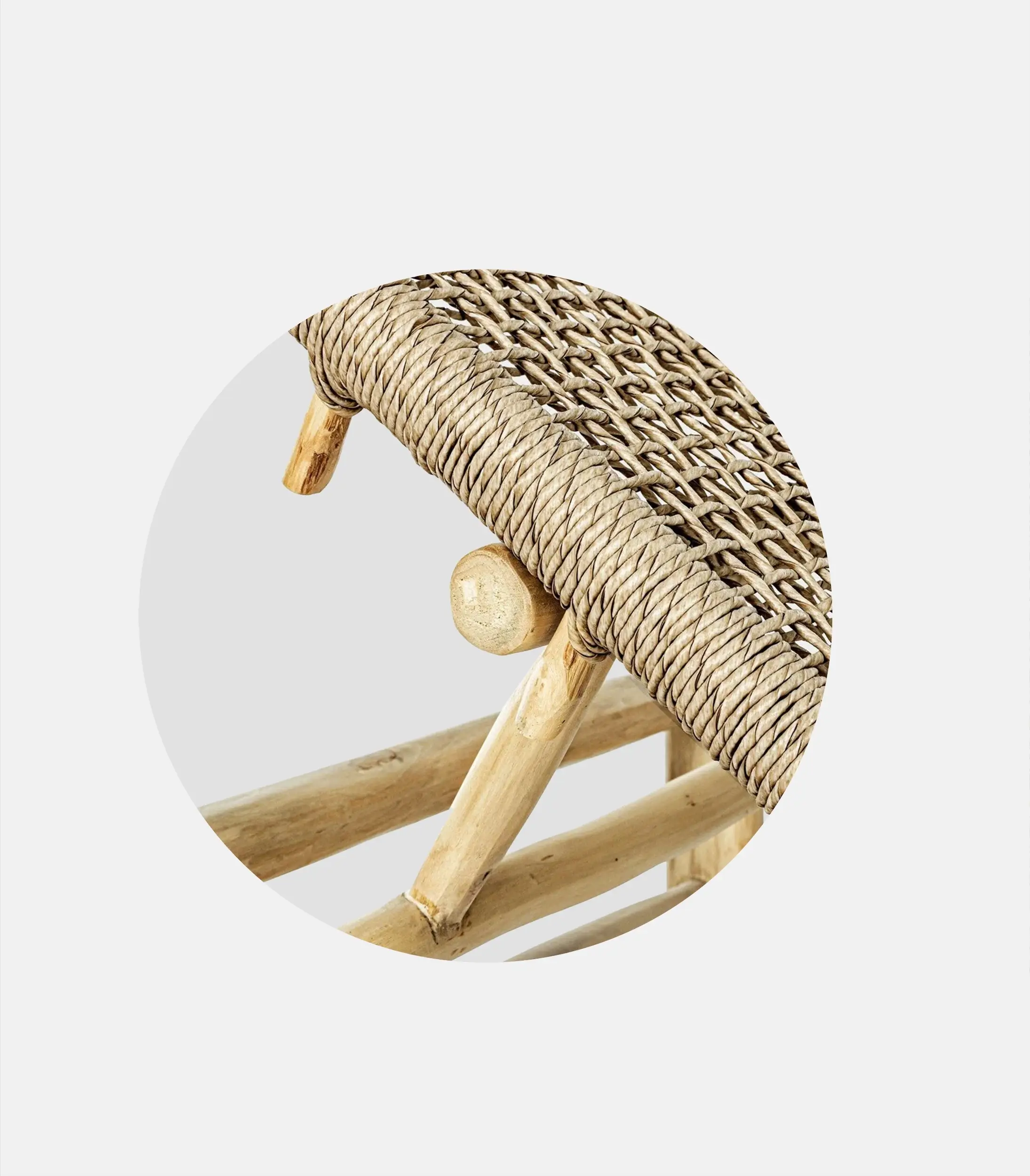 Gaia plays on a lighter, natural aesthetic, with a woven element that gives character while functioning practically. It’s handmade, from teak with teak oil finish and weaving from ecological waterproof thread with UV protection.