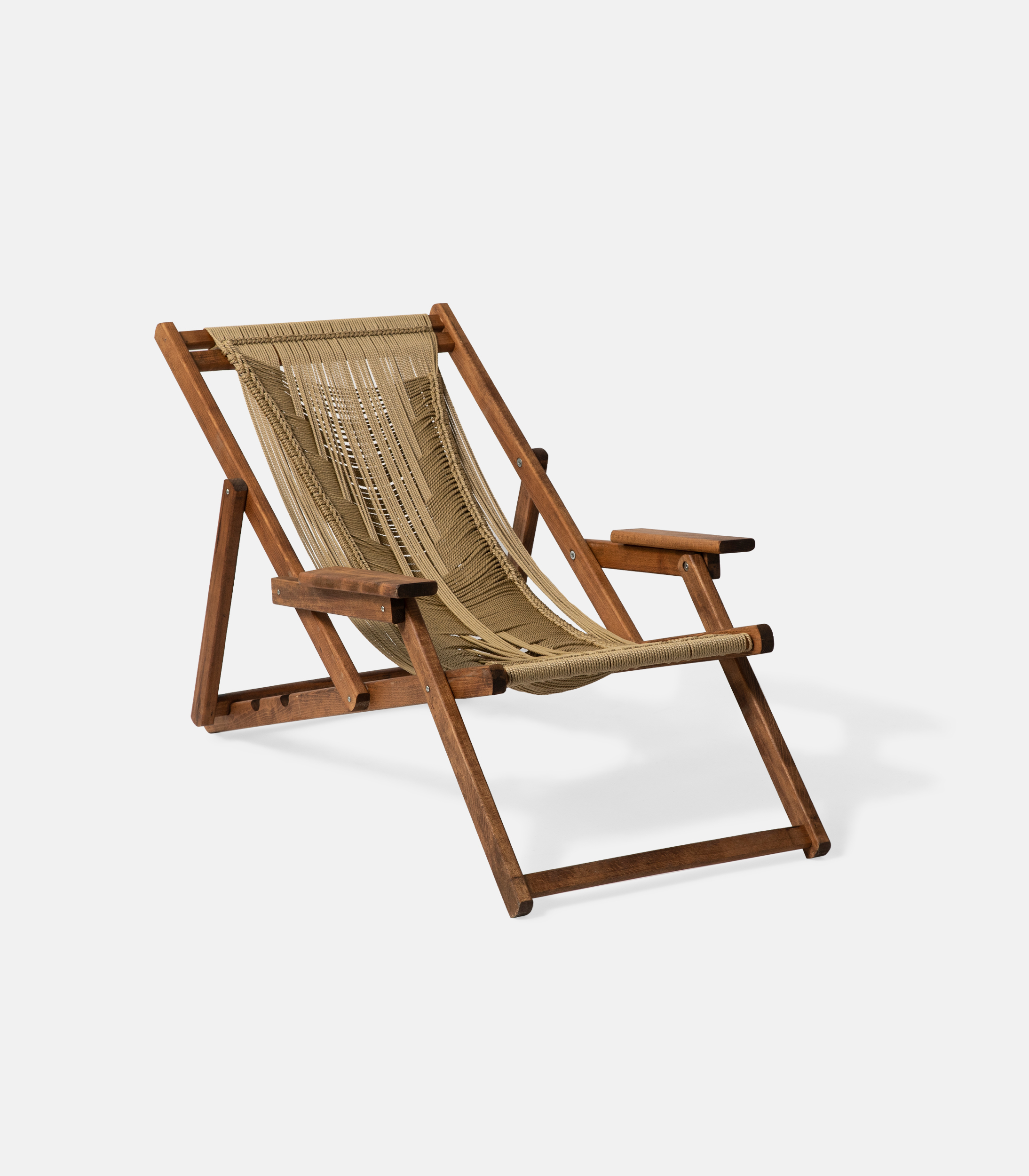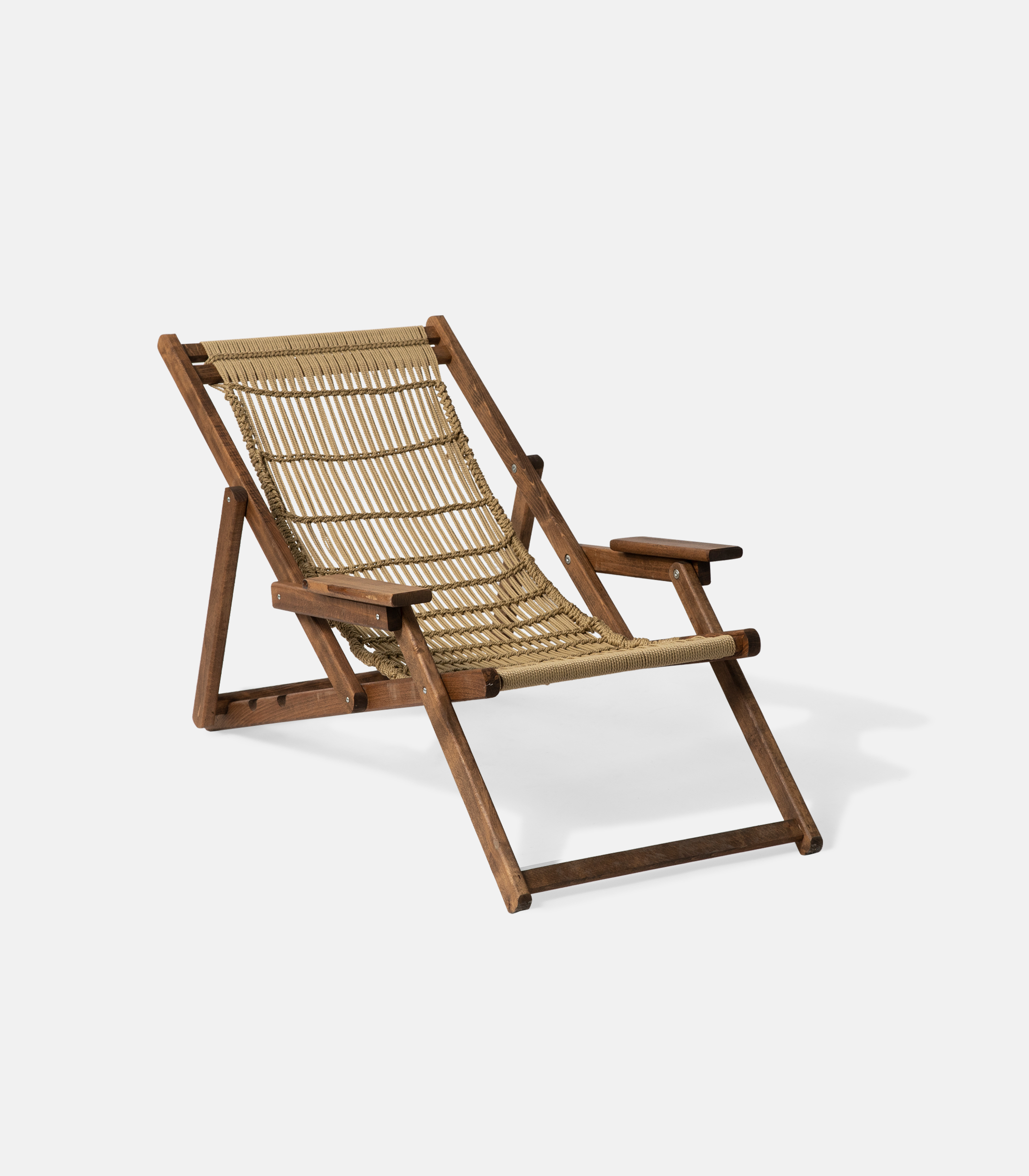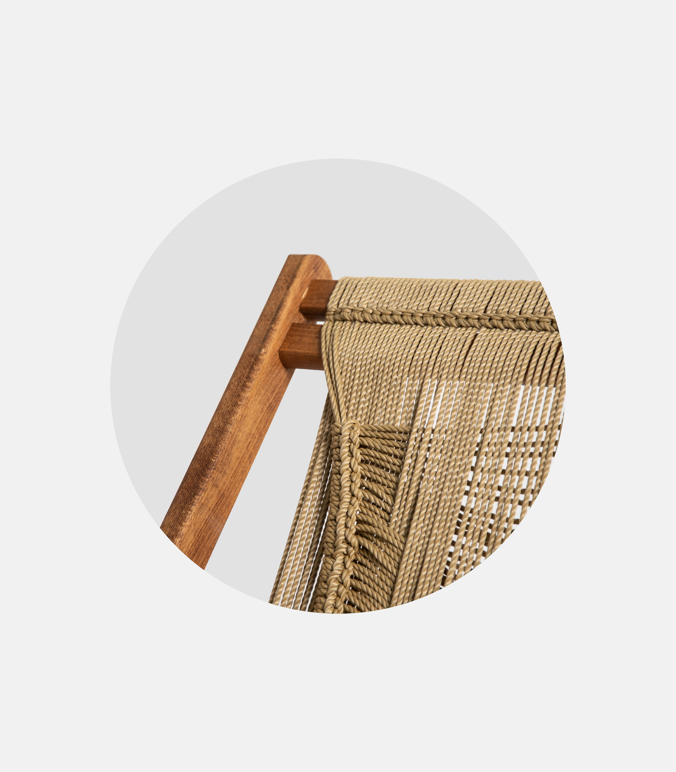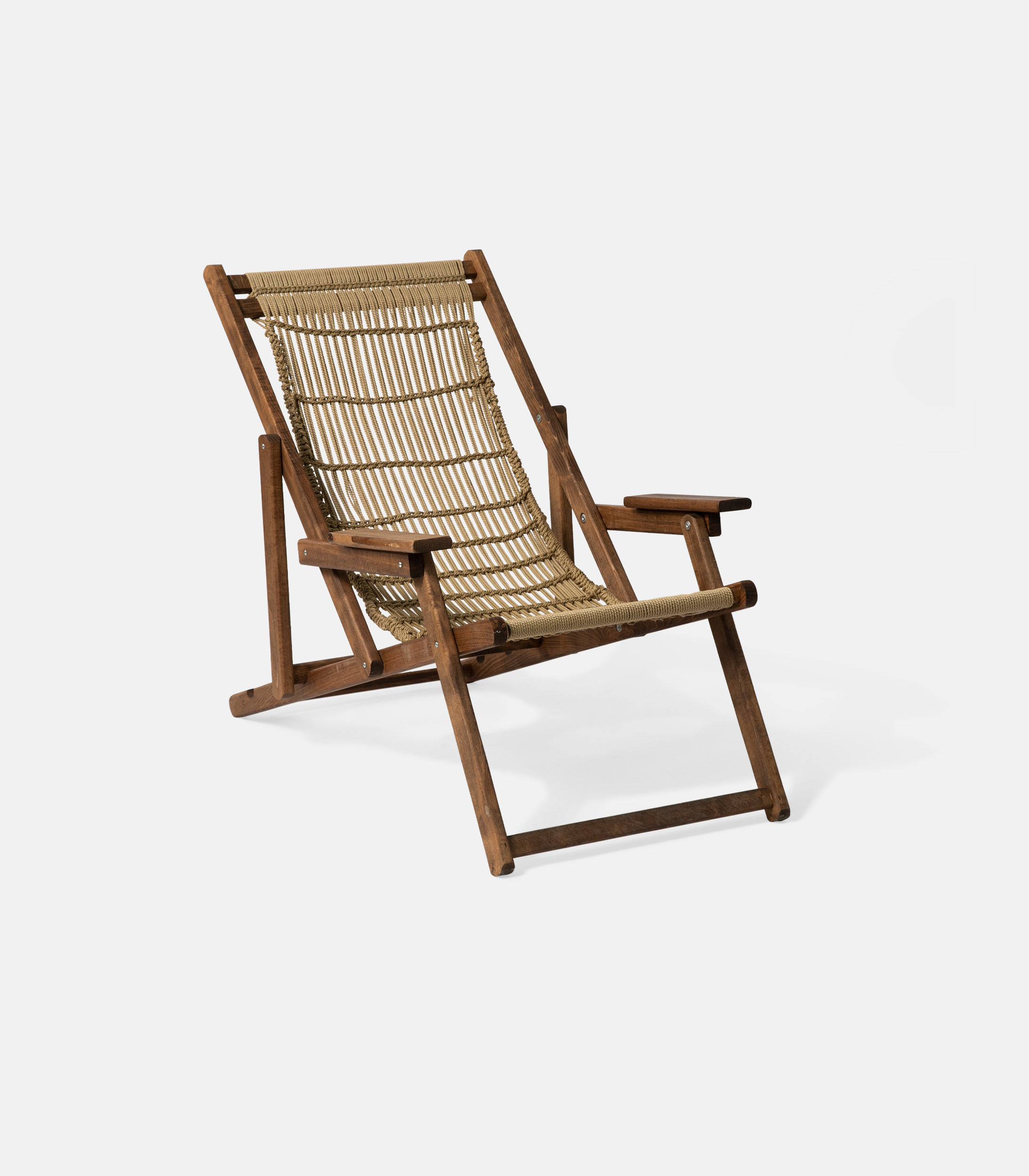 A model that stands out with a more handmade character, without straying from the professional context. The base is made of kiln-dried beech and the weave is done with waterproof rope suitable for outdoor use. It features 3 reclining positions and offers a warmer, natural texture to the space.