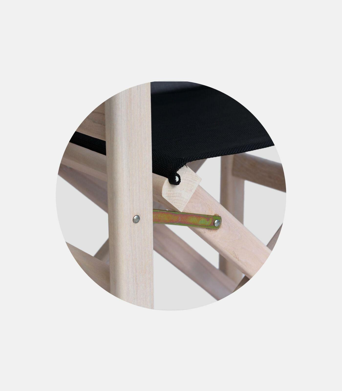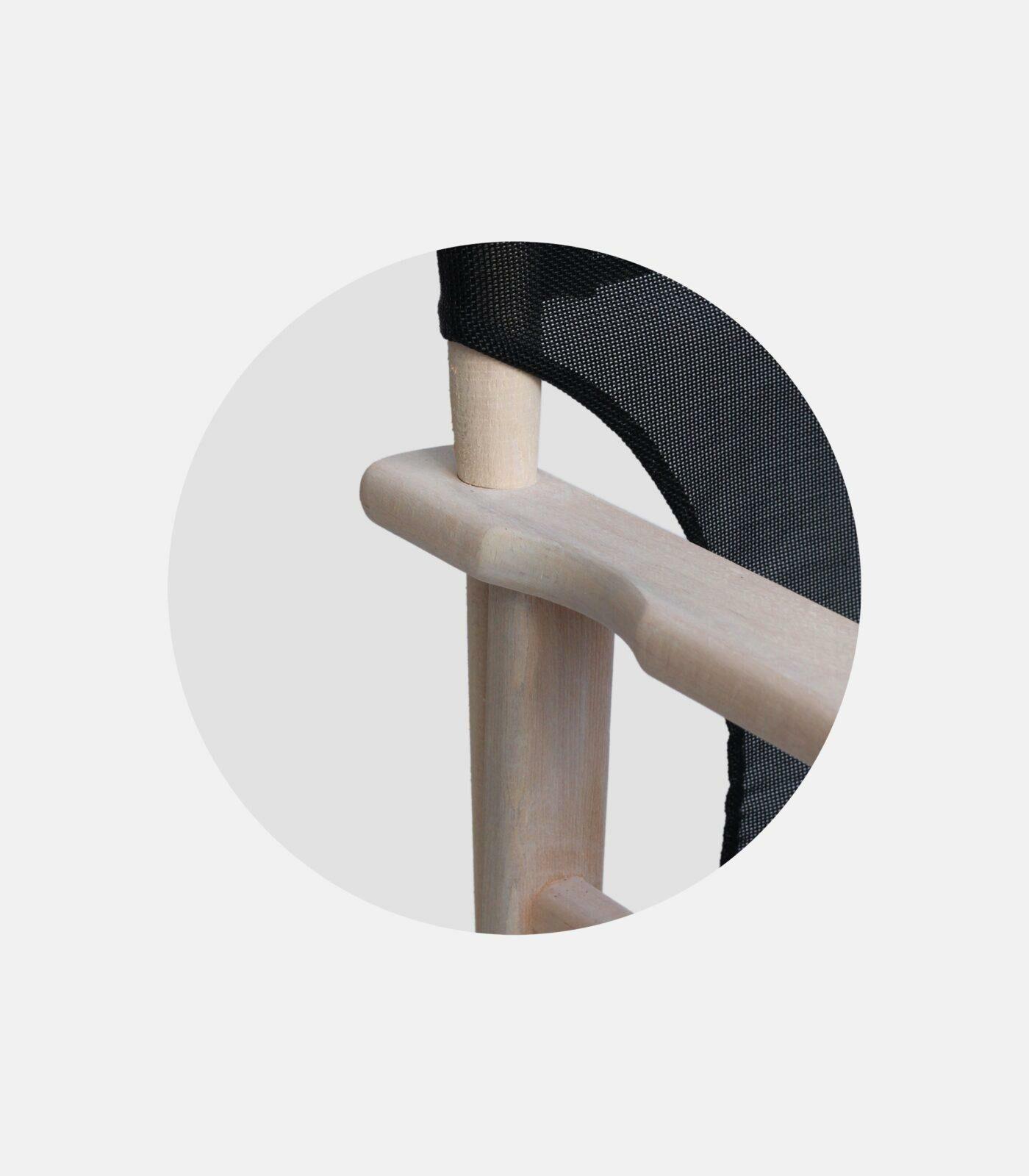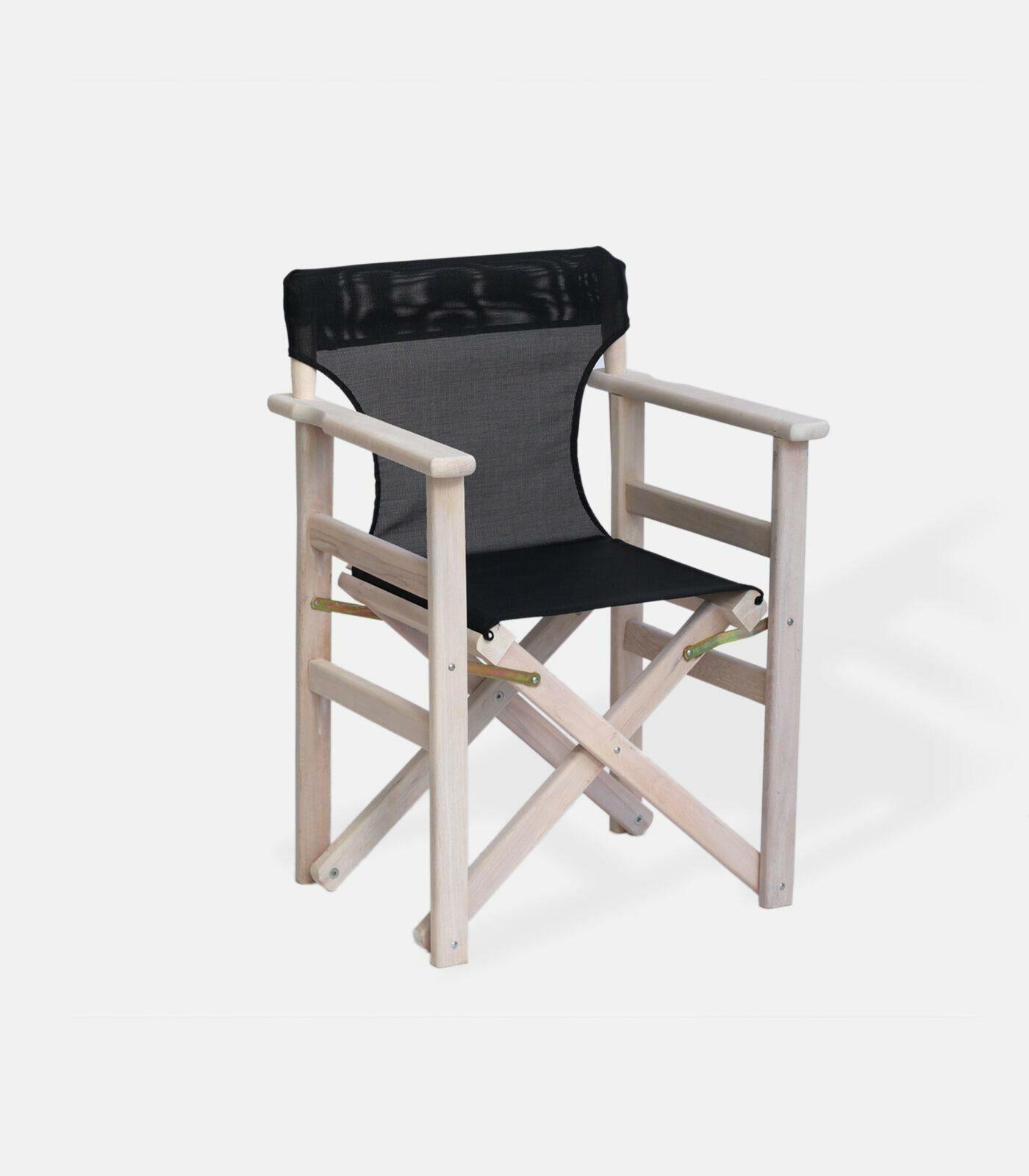 The combination of white wood with black perforated PVC gives a more intense, modern aesthetic, while maintaining the classic director’s line. The base from kiln-dried ash provides sturdiness and proper construction feel, while the perforated PVC is practical for outdoor use and easy to maintain. It’s a choice that looks refined and stable in the space, even in demanding daily operation.