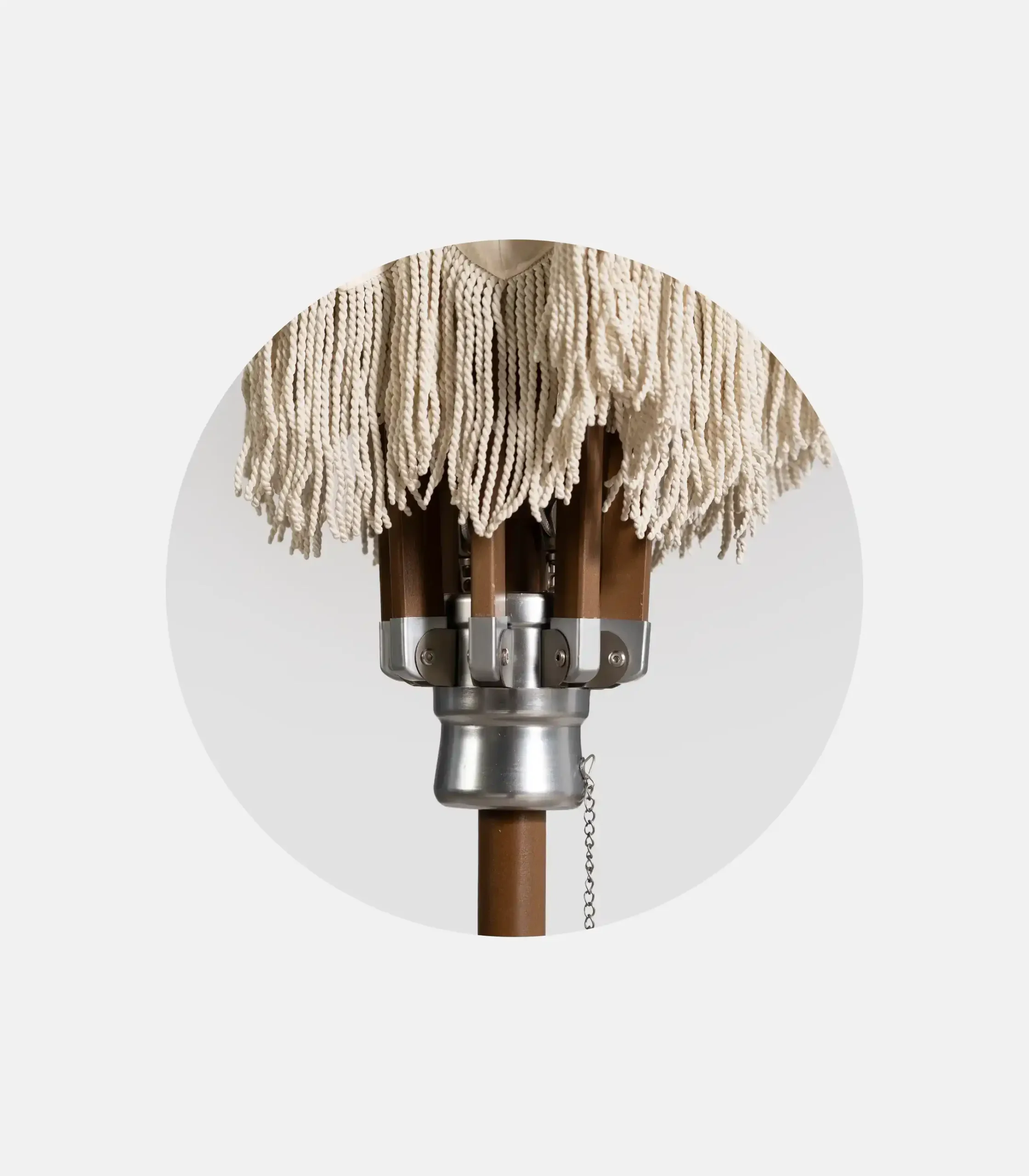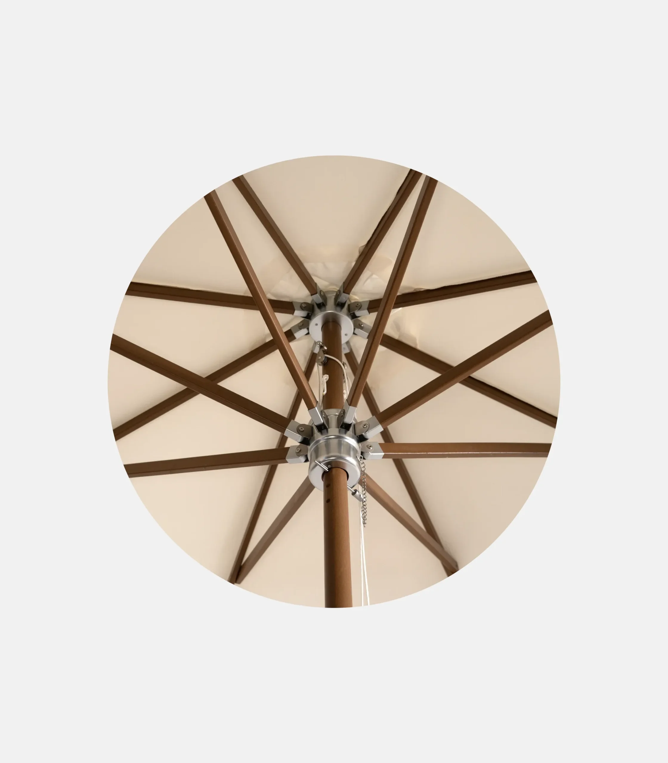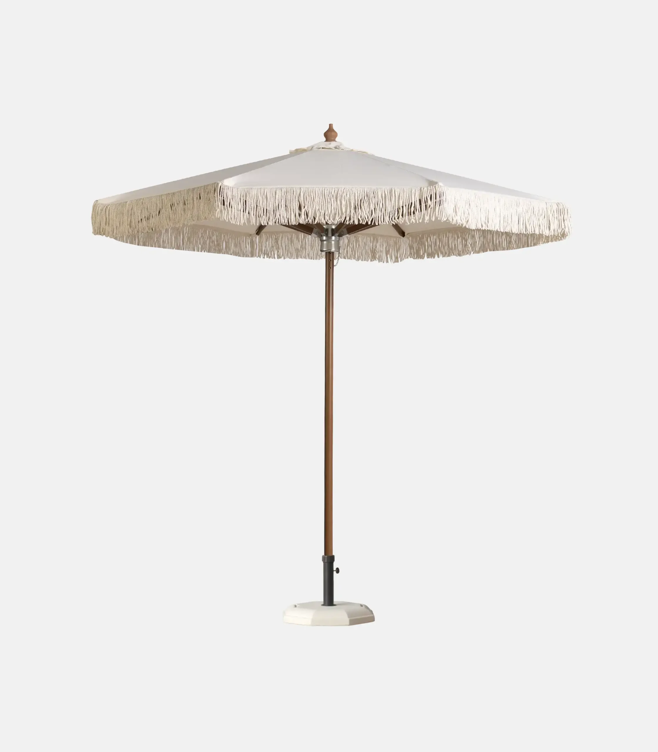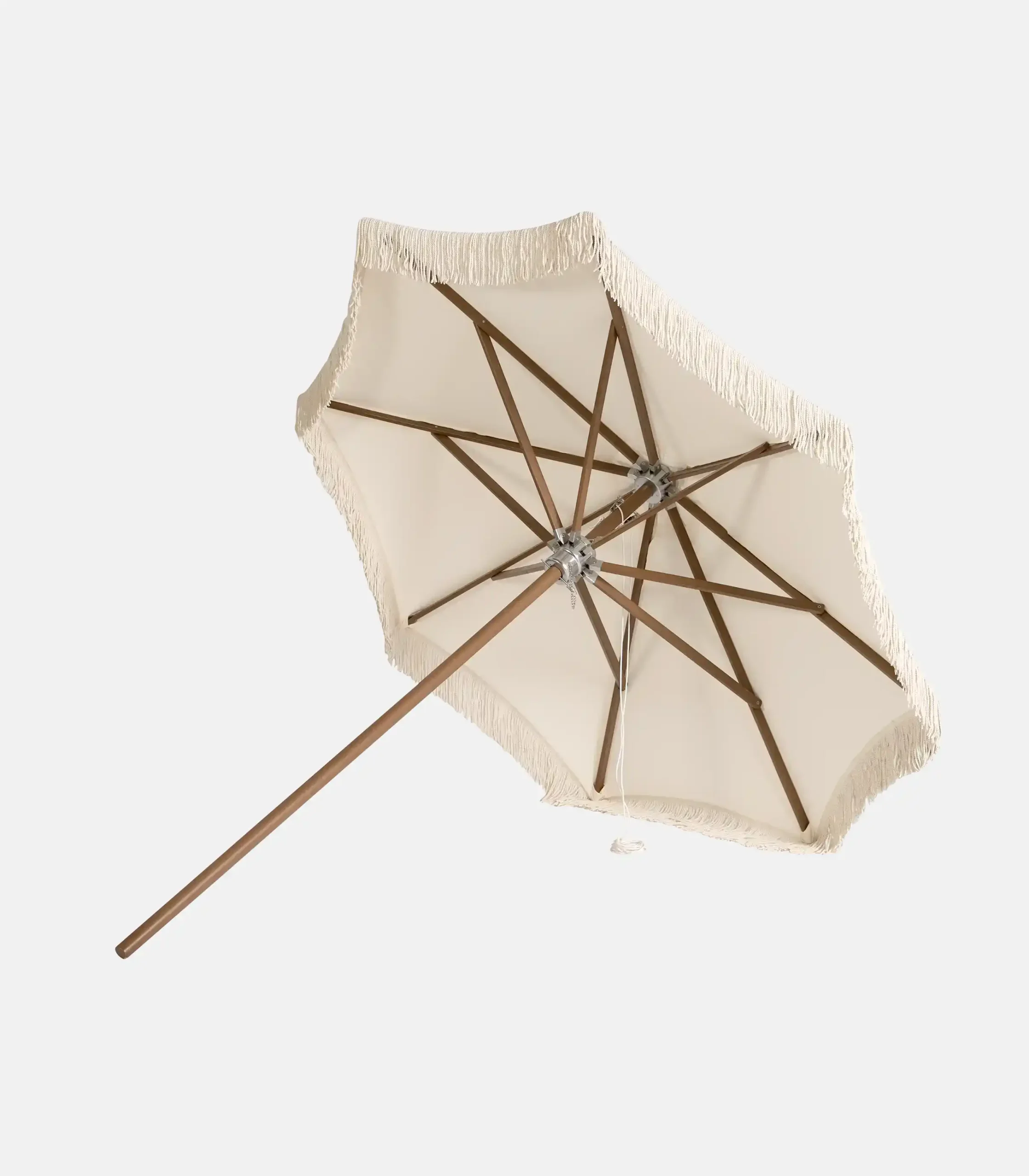The cream version with fringe maintains the elegance of natural wood while adding a more “welcoming” aesthetic to the shading. The structural base remains serious: a heavy-duty Ø48 beech pole and 8 ribs (35×20mm) for proper opening and a stable feel.